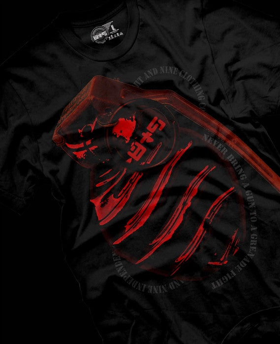 Grenade Fight t shirt inspired by the actual Foamposite shell, features the subtext "Never Bring A Gun To A Grenade Fight" and is guaranteed to perfectly match the Metallic Red Foams. This print is not FOIL! No tin man print.