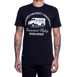 2017, simplicity reigns supreme. Run with us and we'll deliver the goods, Guaranteed Safely, every time. Armored truck design inspired by the classic Dead Presidents movie. Premium mens cotton black t shirt with white print front and back.