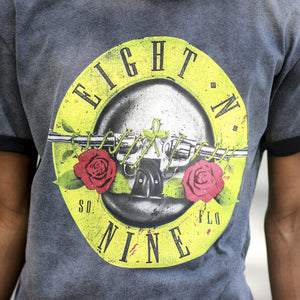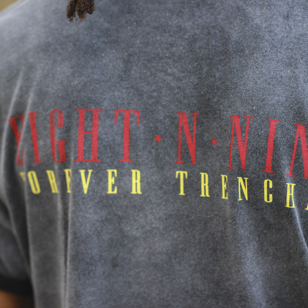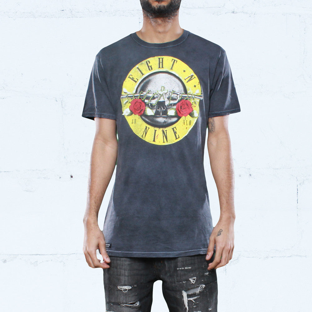 New Long Line T Shirt for 2016. 80s inspirations, heavy distress, vintage styling. Black spray washed Guns N Trenches short sleeve shirt. Super soft, 30 singles cut with added length for a modern fit, hi-low finish. Peep the details.