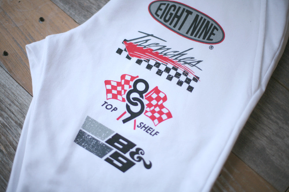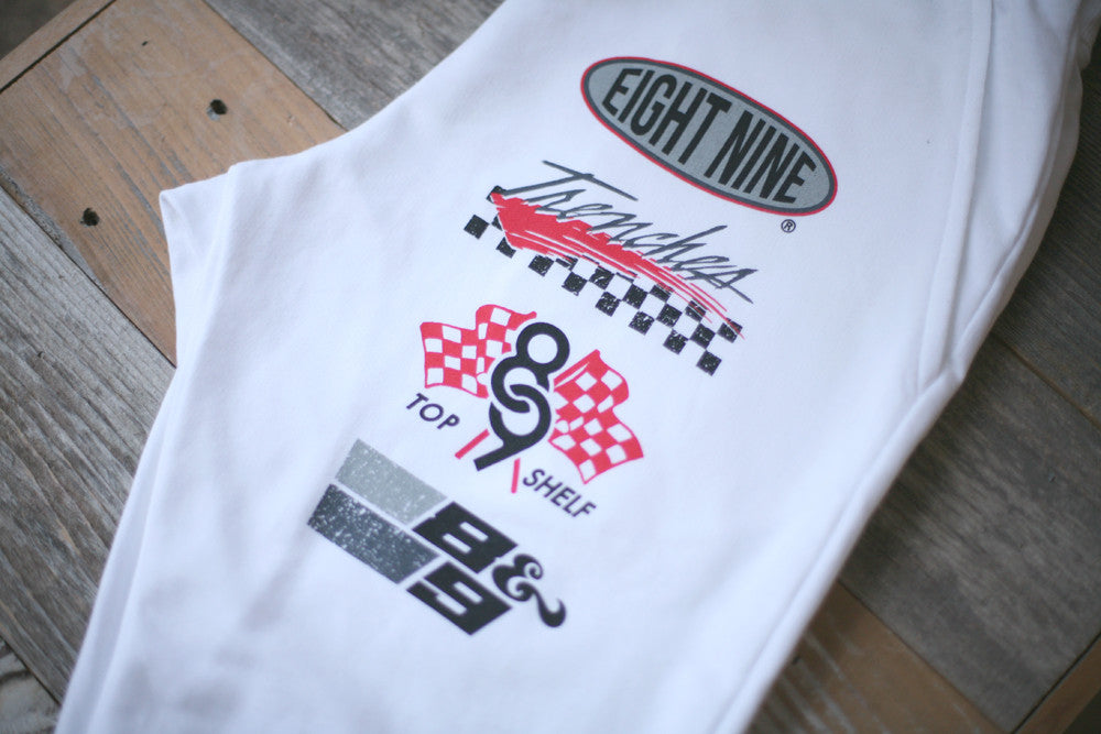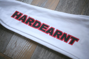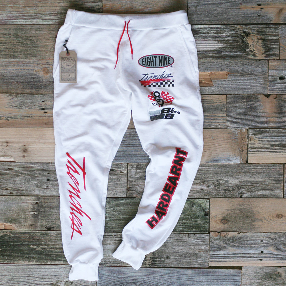 New for Holiday Nascar race inspired Hardearnt French Terry Yard Sweats. Super luxe 100% cotton french terry sweat pants made in the USA. Player white with multi color jumbo leg hits and matching sneaker lace draw string. Modern tailored fit. Slight drop crotch, great sweat pant to match the white Hardearnt hockey jersey. #8and9life