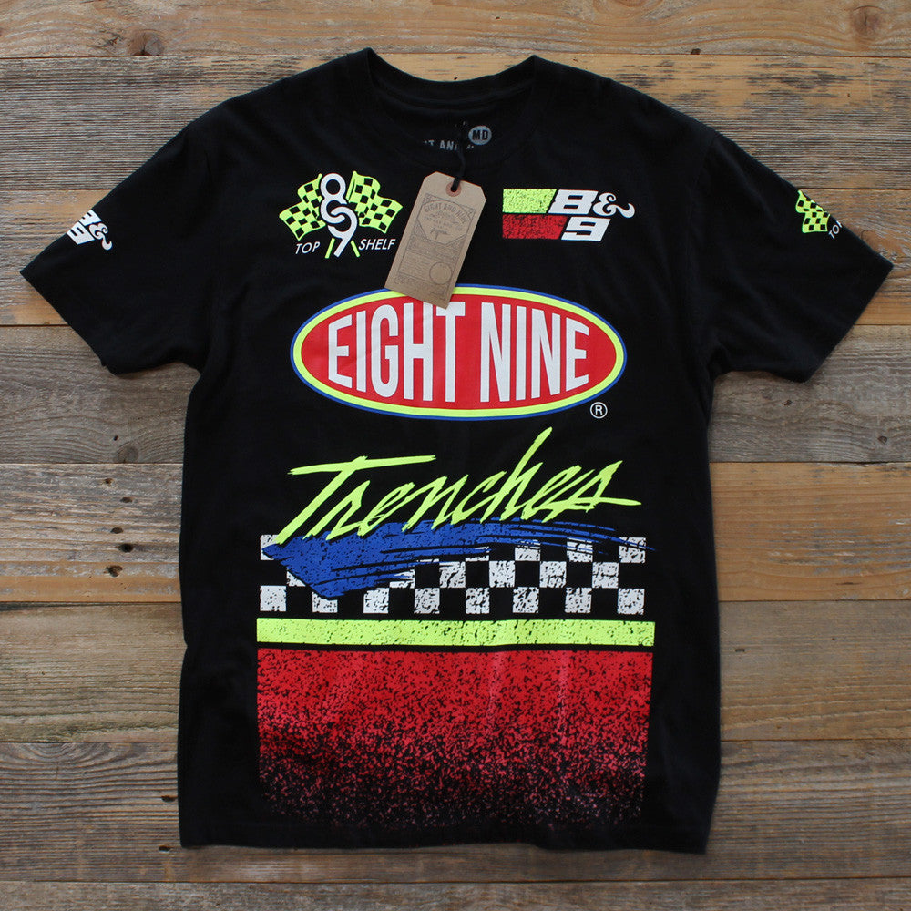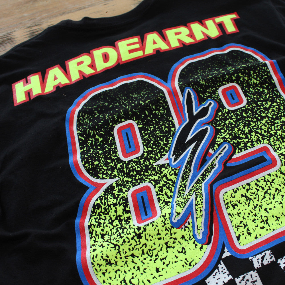 New jersey for Spring '15. Nascar race inspired short sleeve jersey tee. This is the perfect shirt to match Volt Foamposite Pro. Premium black and volt by popular demand. Peep the details. HardEarnt name plate. Front, back, two sleeve prints. This one won't last long! Buy it now while supplies last.