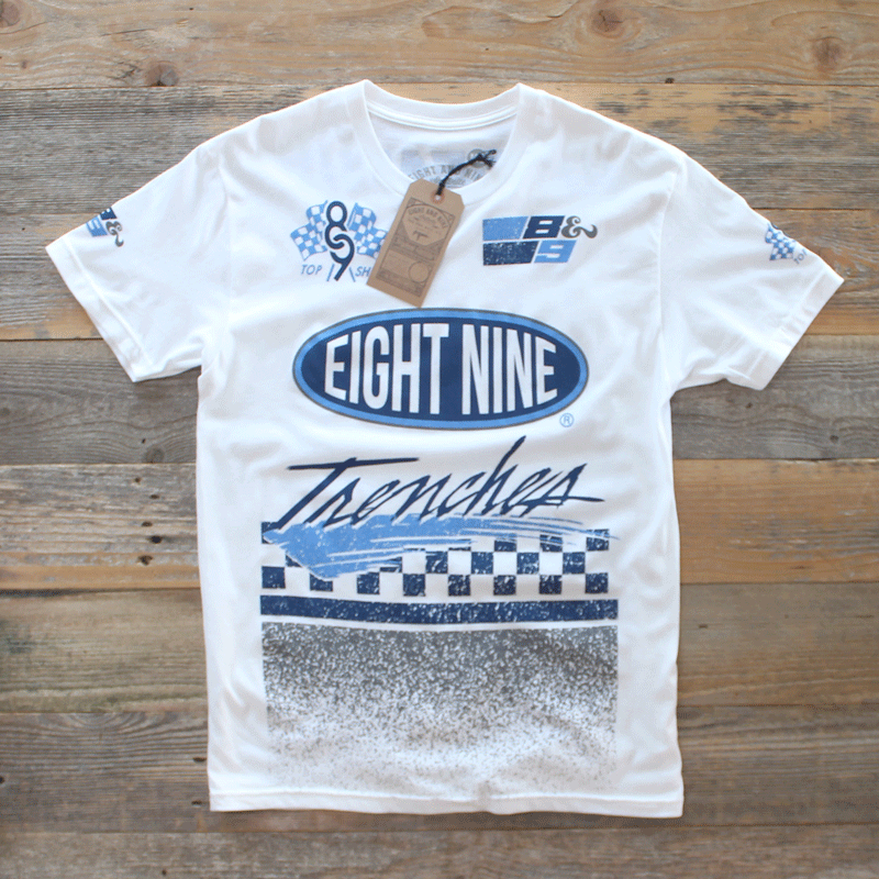 New jersey for Spring '15. Nascar race inspired short sleeve jersey tee. Premium white with French Blue. Peep the details. HardEarnt name plate. Front, back, two sleeve prints. S-4X available while supplies last.