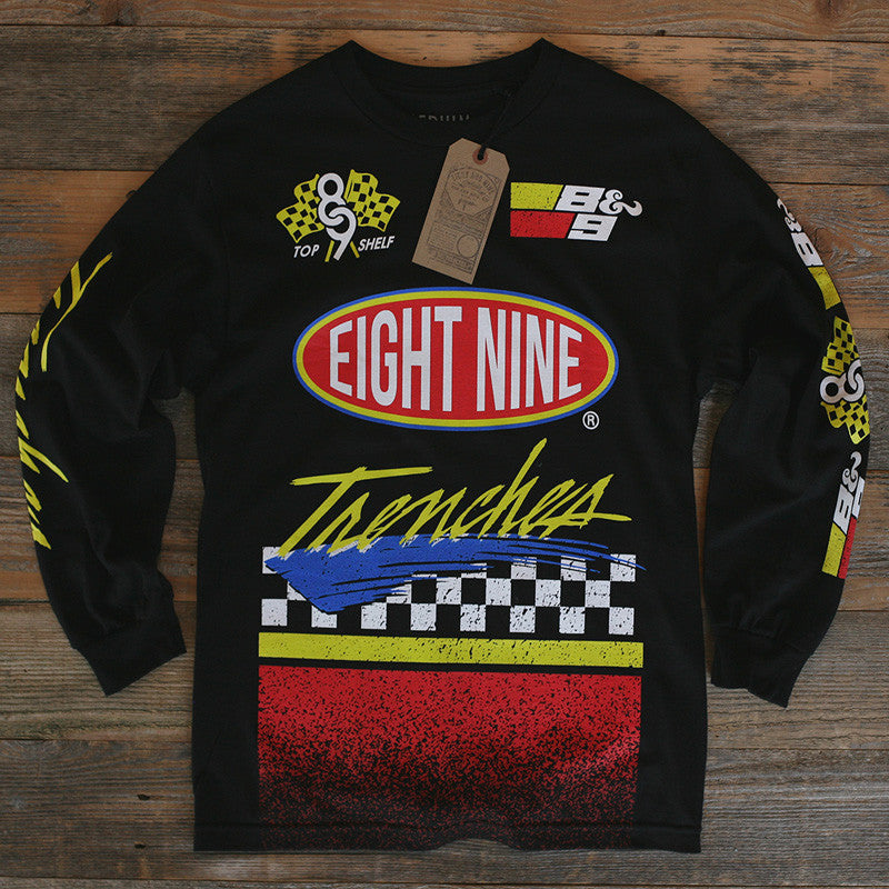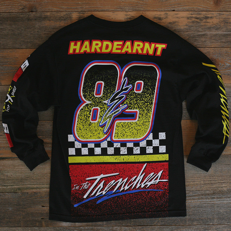 New for winter '14 Nascar race inspired long sleeve Jersey Tee. Black/Volt/Multi peep the details. HardEarnt name plate. Front, back, two sleeve prints. S-4X available while supplies last.