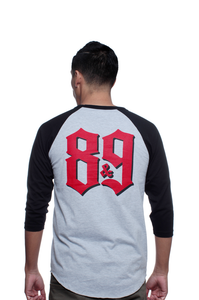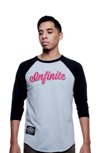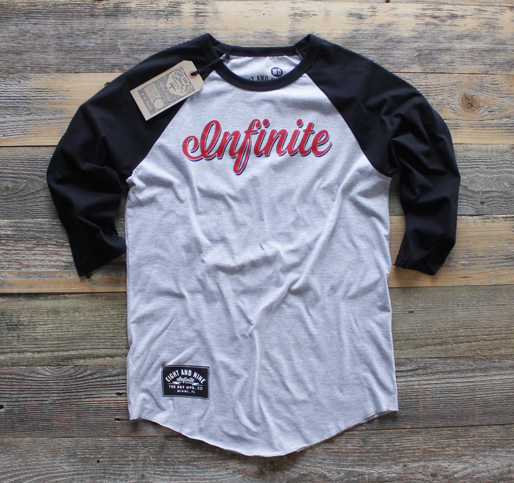 Simplicity reigns supreme. Infinite chest print in fire red on a cement grey body with black contrast sleeves. 89 Number hit on back. #8and9life Check the details. Super soft cotton 3/4 sleeve classic fit baseball shirt.