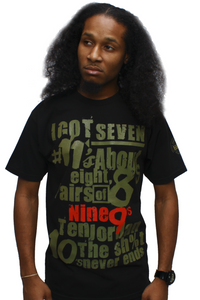 The graphic draws from Biggie's infamous Live 95 Freestyle where he rapped alongside Scoob, Big Daddy Kane, Tupac & Shyheim. The lyrics flipped in tribute to some Notorious Jordans. "I Got Seven # 11's About 8 Pair Of 8's Nine 9's Ten Jordan 10's The Sh%t never ends." Black/Olive/True Red this color is a perfect shirt to match Air Jordan Olive 9.