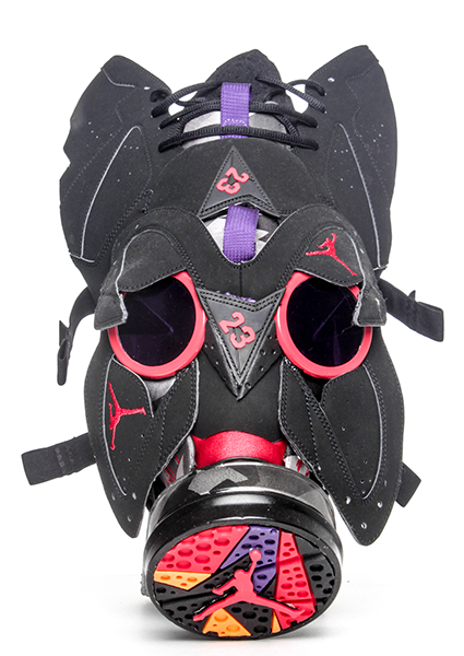 Freehand Profit chopped these 2013 Jordan Retros in front of a fantastic 2012 Art Basel crowd at our Wynwood Pop Up Shop.  It was unveiled at SneakerCon Miami in June 2013. The Raptor 7 mask features a custom painted canister to match the iconic tongue pattern. This piece (like all of Freehand Profit's sneaker masks) is 1 of 1, it comes with a signed Certificate of Authenticity and display head with adjustable wall mount. This mask was featured during Art Basel 2012 as part of 8&9's Pop Up Shop/Art Gallery. This mask will release on freehandprofit.com on 9/15/2013.