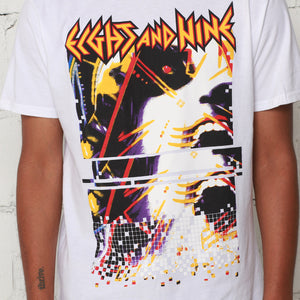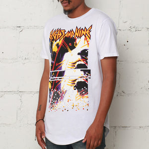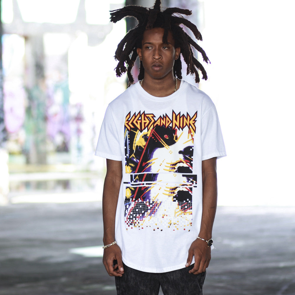 Inspired by the show. Jordan Sweater 7 Shirt Curved Hem Hysteria Tour Tee. 80's vibes, digital glitch, pixels and all that. Simplicity reigns supreme, full front print, slightly extended length (not a dress), with a curved hem and modern fit.