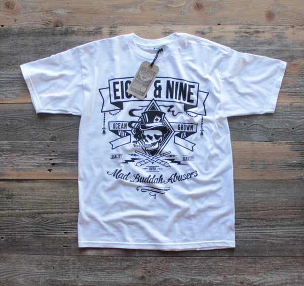 Ocean Grown shirt in white and black color scheme to match Air Jordan Taxi 12. Peep the details. Mad Buddah Abusers, Ocean Grown Air Jordan Taxi XII match.