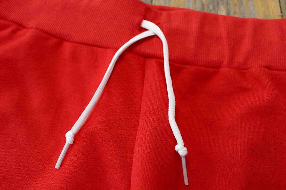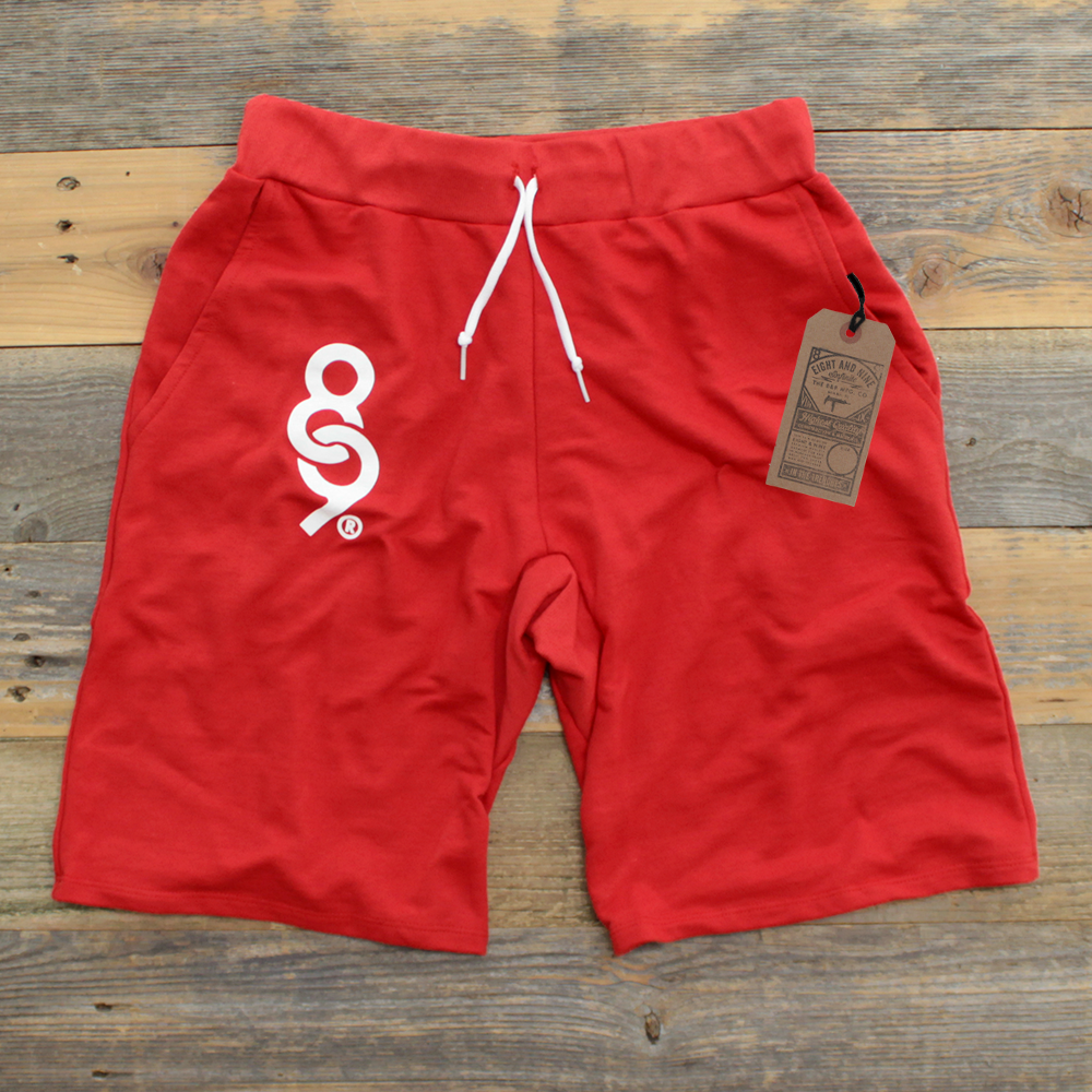 Simplicity reigns supreme. Super luxe 100% cotton french terry sweat shorts made in the USA. Fire Red/White. SB shoe lace draw string. Modern tailored fit. Slight drop crotch. #8and9life