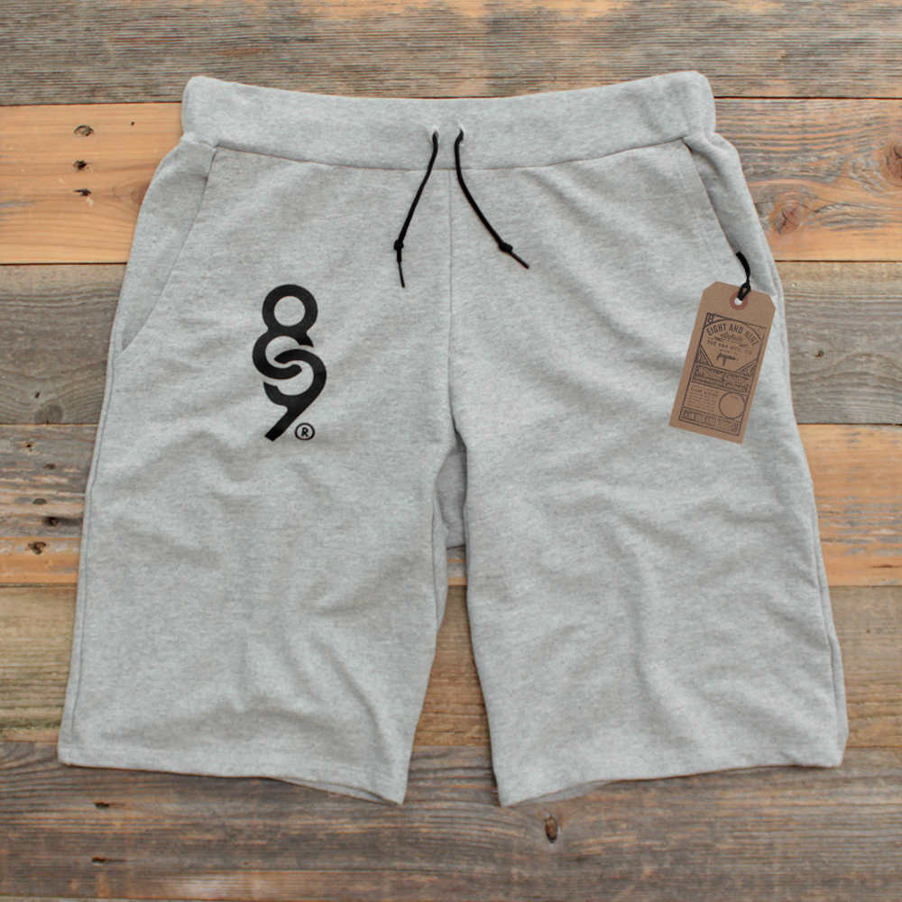 Simplicity reigns supreme. Super luxe 100% cotton french terry sweat shorts made in the USA. Heather Grey/Black. SB shoe lace draw string. Modern tailored fit. Slight drop crotch. #8and9life
