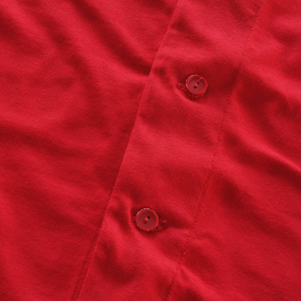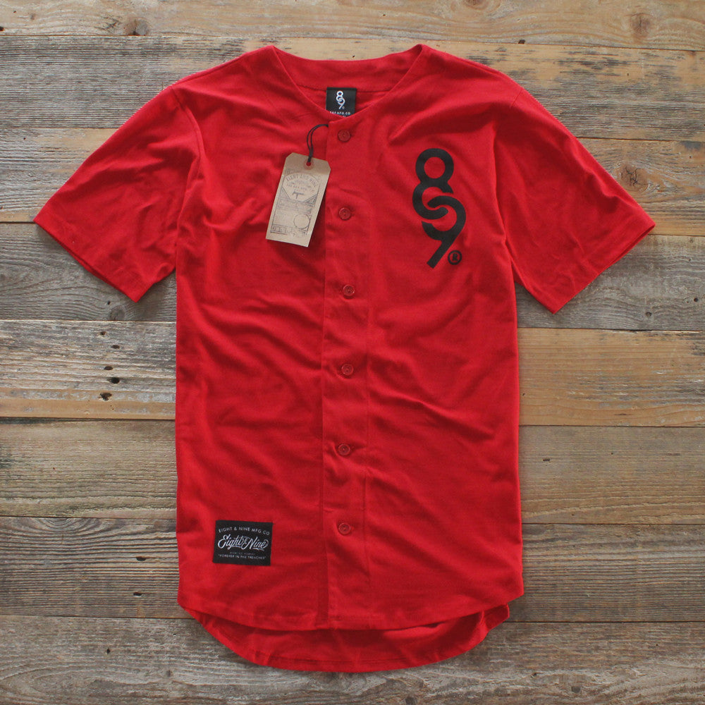 It's hot out here! So we've introduced a 100% cotton baseball jersey cut from our premium t shirt material. A 6 ounce cotton baseball jersey for summer to keep you cool and fly at the same dam time. Fire red with tonal buttons, keys logo hit and woven label Modern tailored fit.