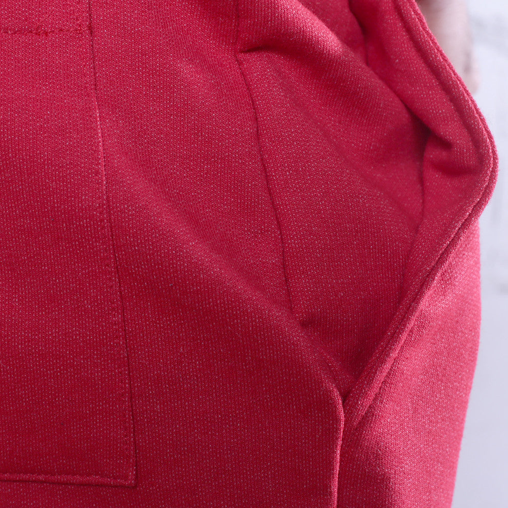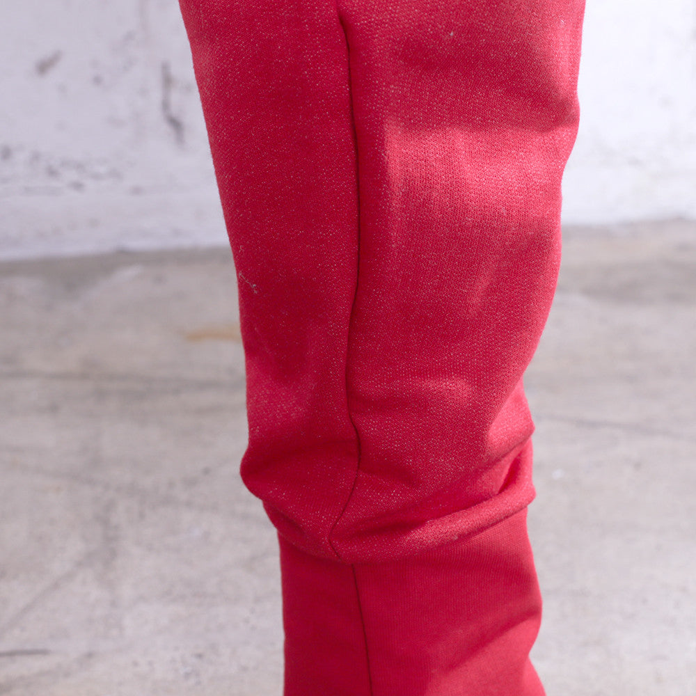 New light-weight French Terry Joggers for all seasons, made in the USA. Fire red premium terry jogger with black chain stitch Keys logo, elasticized waistband, three pocket styling, rib knit tapered bottom. Modern tailored fit.