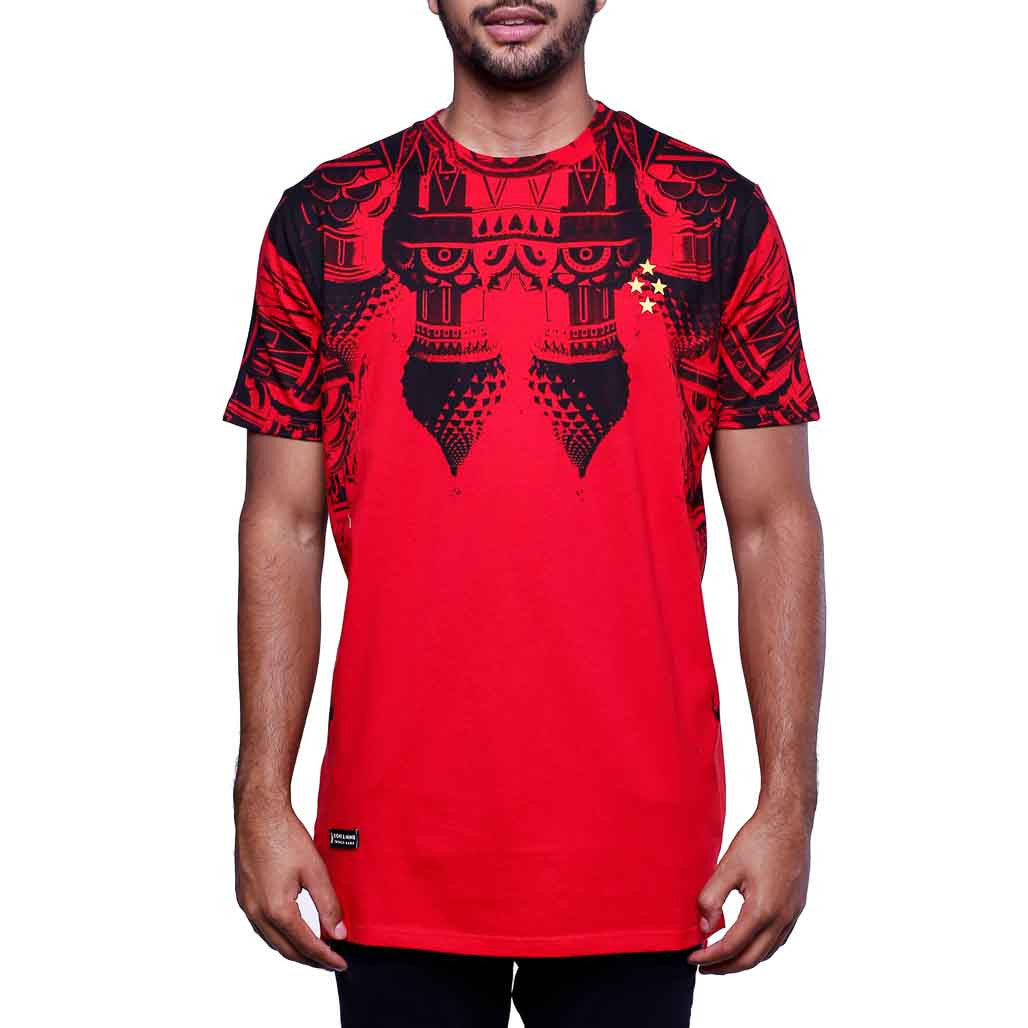 New drop! Kremlin Tee, premium cut & sew garment for Fall '16. Kremlin T Shirt Red. Beautiful craftsmanship right here, peep the print layout, red body, black all over print with stacked Gold Stars. Sick contrast in color and texture, hi-lo hem for definitely a top choice this season designed specifically to stand alone or be layered with your favorite jacket.