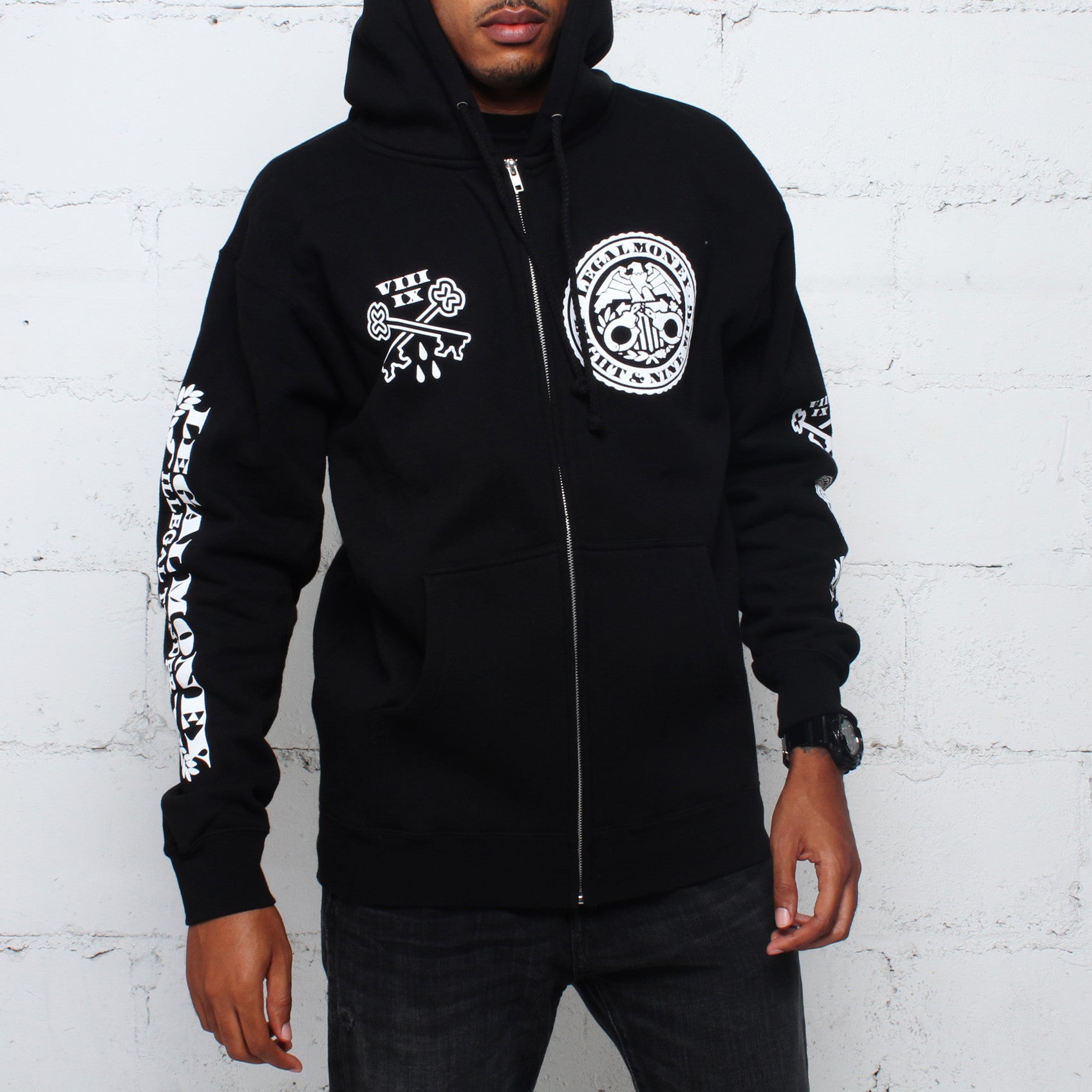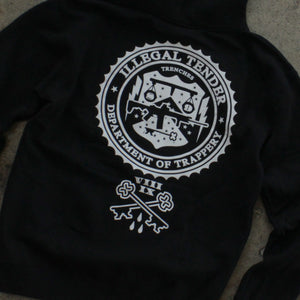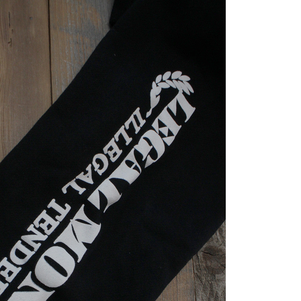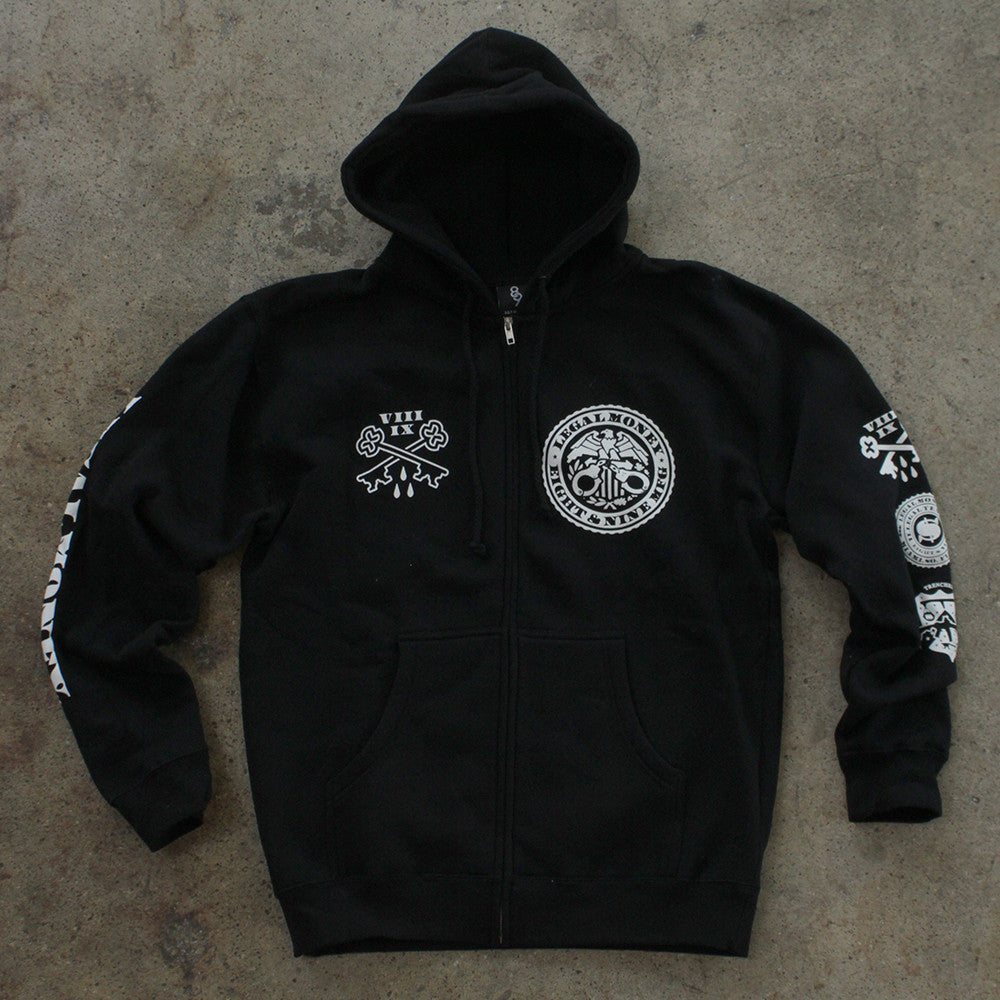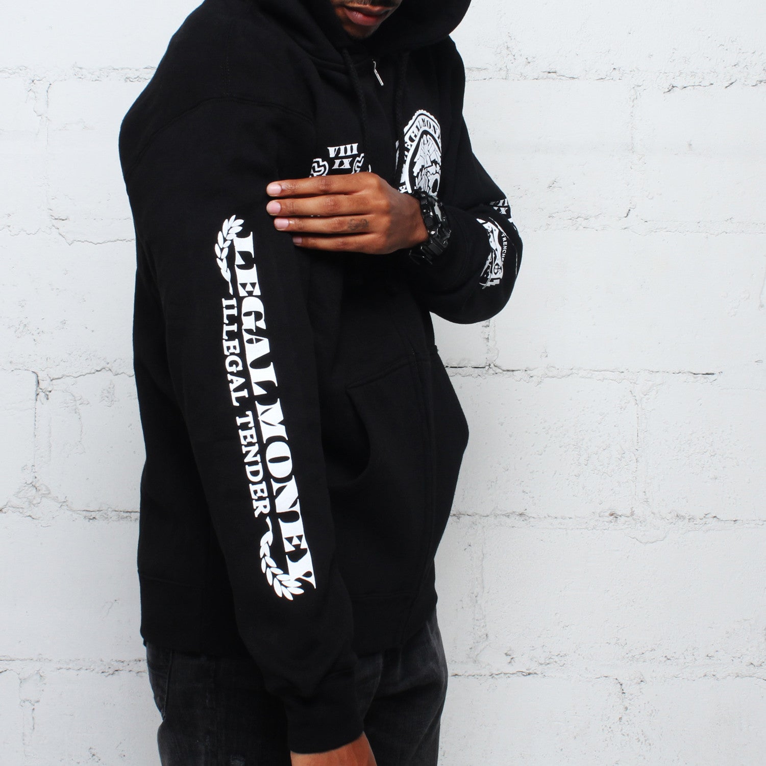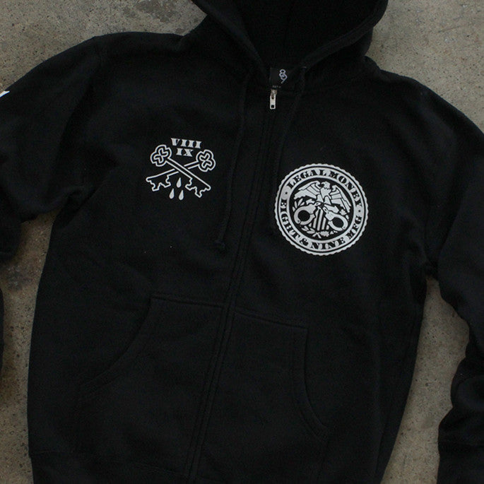 Legal Money Hooded Sweatshirt. Heavyweight. 100% premium cotton zip up hoodie with nickel zipper. Jet black with white, classic styling, front back and both sleeves. Legal Money, Illegal Tender, peep the details. #8and9life