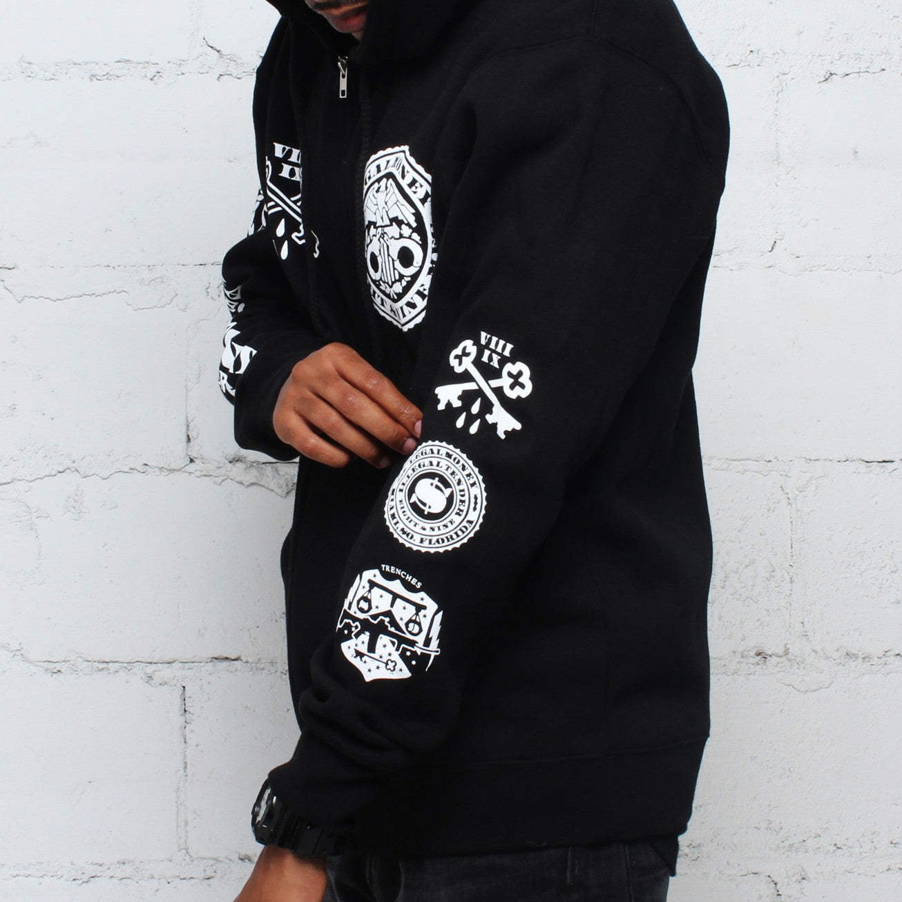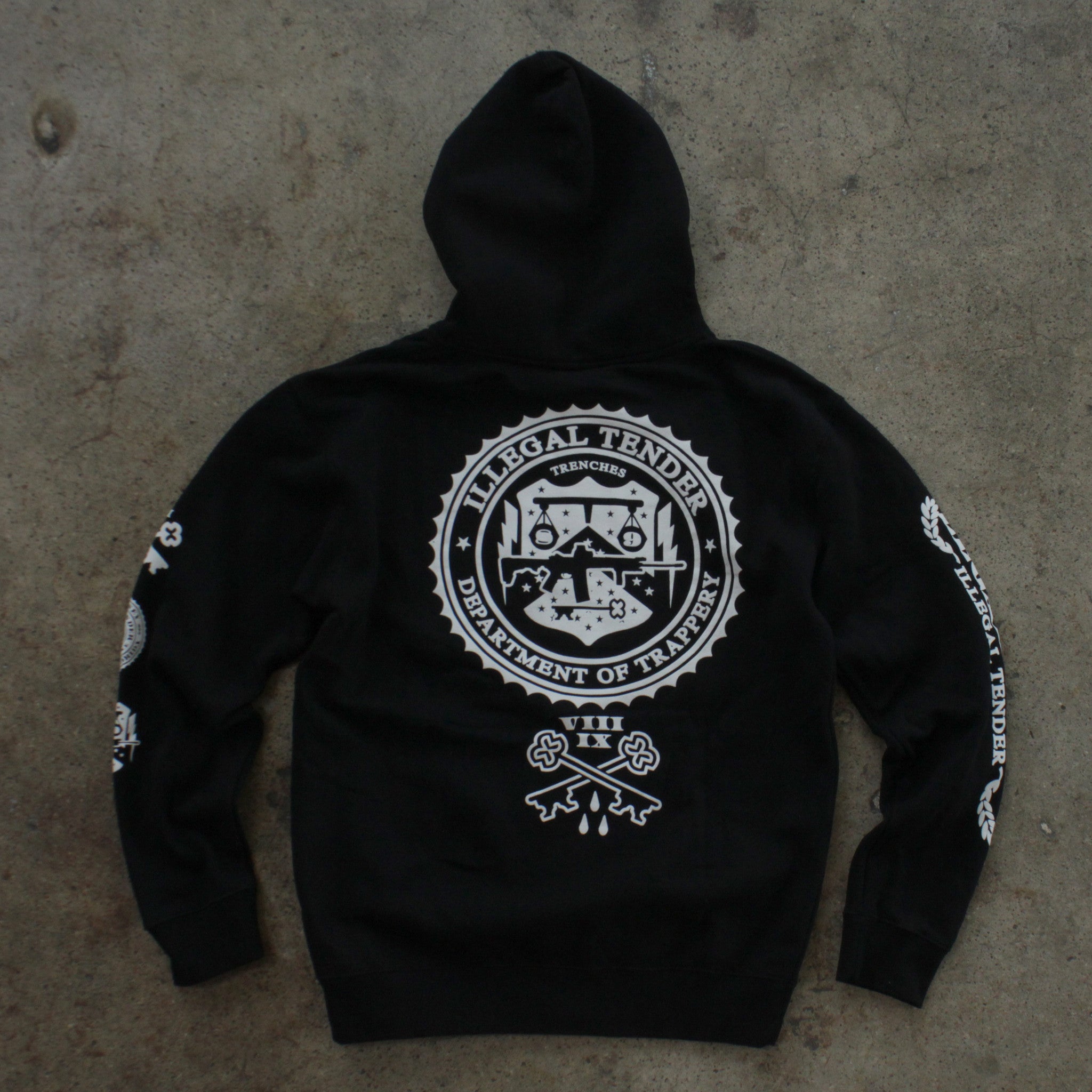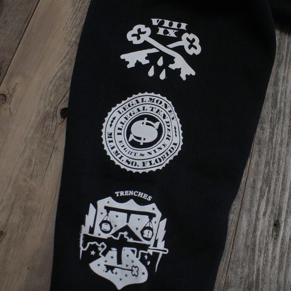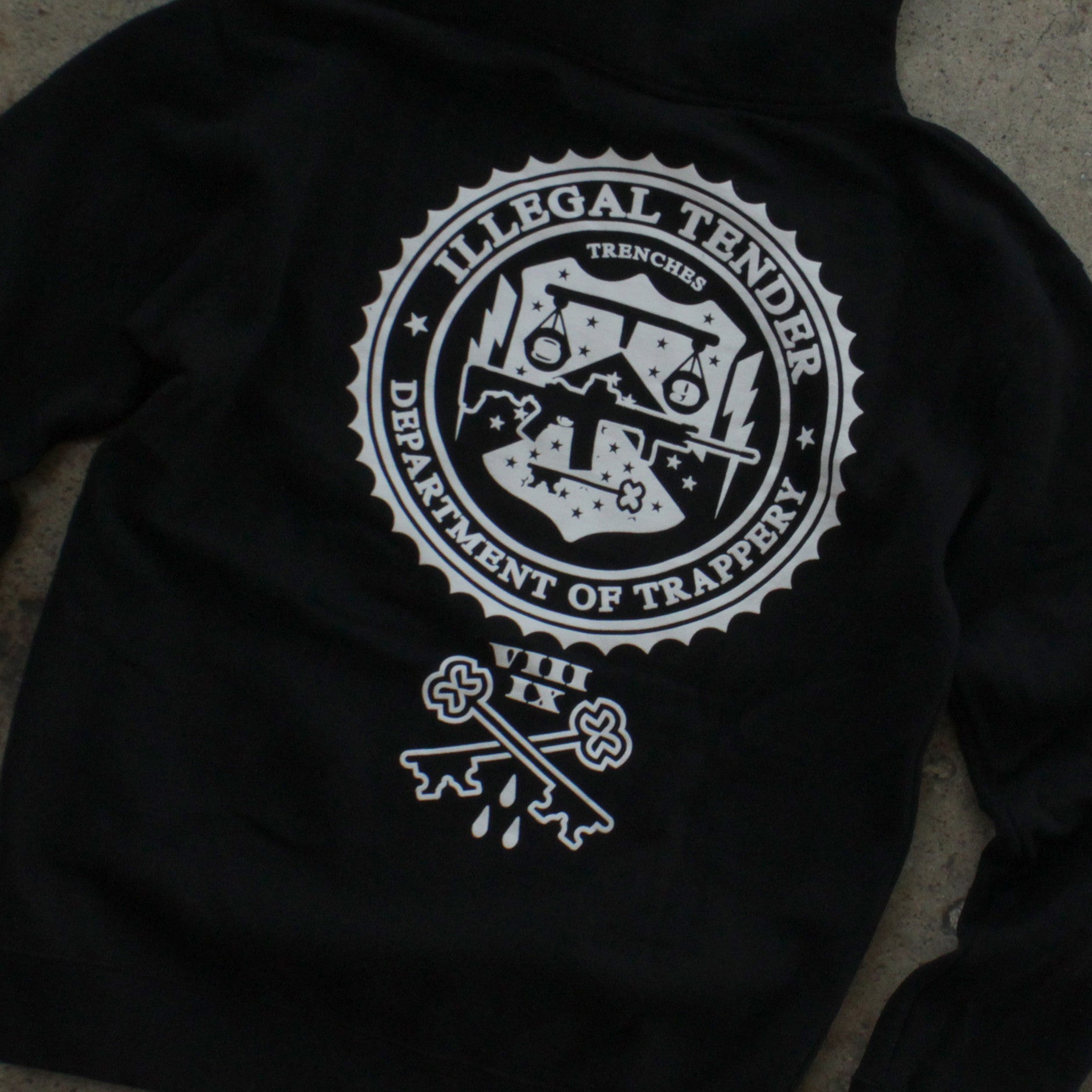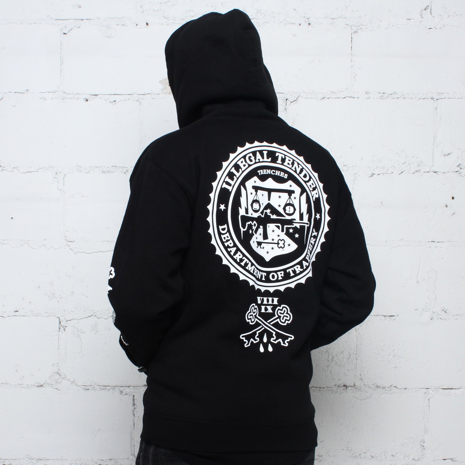 Legal Money Hooded Sweatshirt. Heavyweight. 100% premium cotton zip up hoodie with nickel zipper. Jet black with white, classic styling, front back and both sleeves. Legal Money, Illegal Tender, peep the details. #8and9life