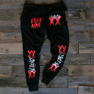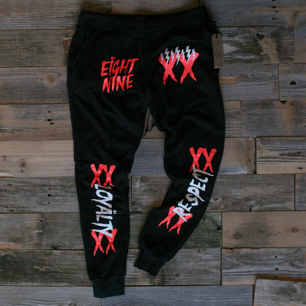 New for Holiday Lobby Runnin' French Terry Yard Sweats. Classic infrared colorway. Super luxe 100% cotton french terry sweat pants made in the USA. Black with jumbo infrared and black leg hits and sneaker lace draw string. Modern tailored fit. Slight drop crotch, great sweatpant to match anything fire red. #8and9life