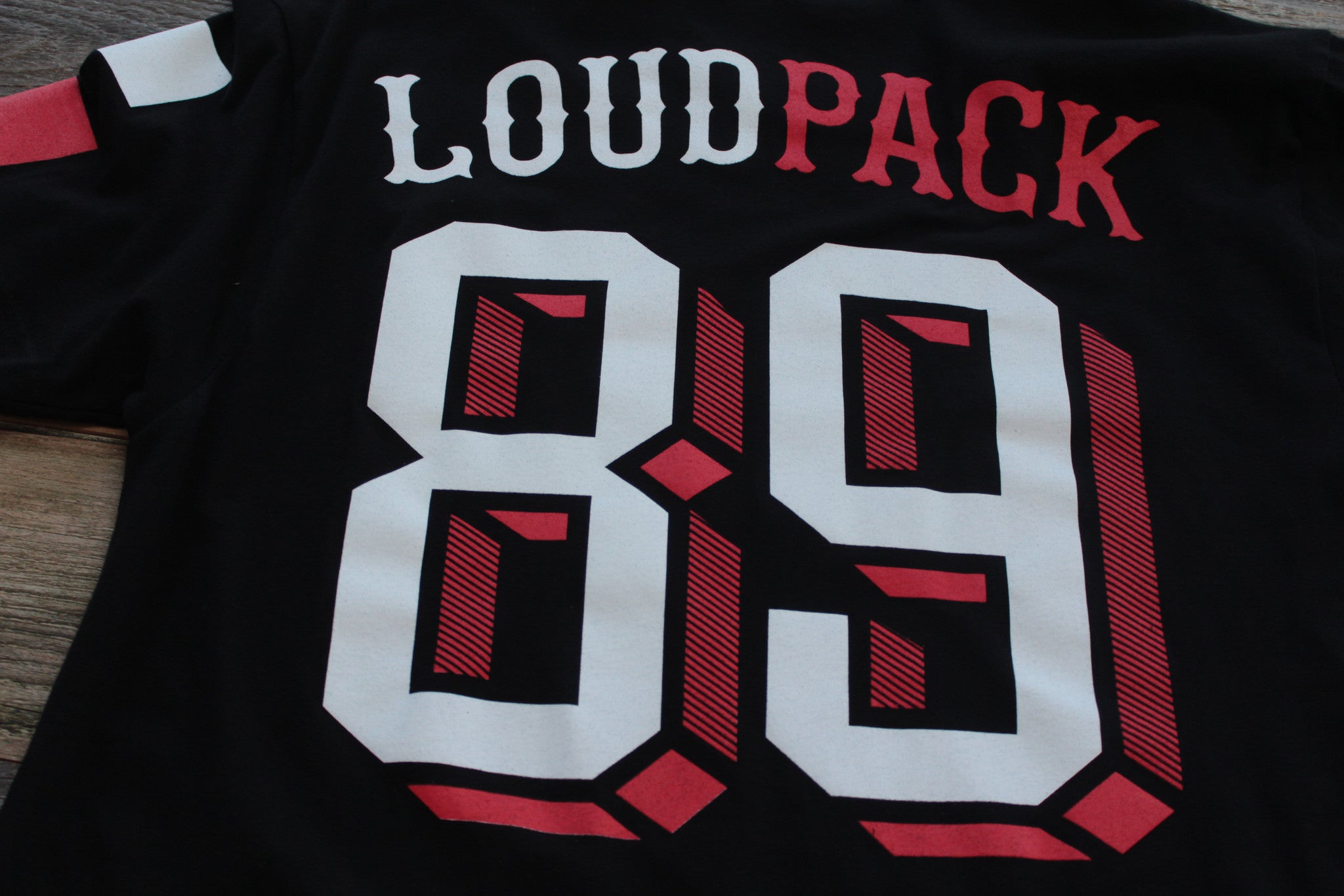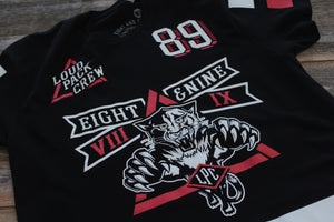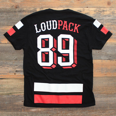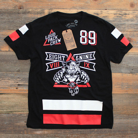 Brand new for Summer '14. Panthers inspired Loud Pack hockey jersey tee. Classic Bred, color scheme. Black T Shirt, w/ Red & White print. Loud Pack Crew, giant 89 number hit, jersey stripes shoulder and sleeve crests. Get yous while you can. s-4X.
