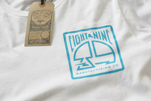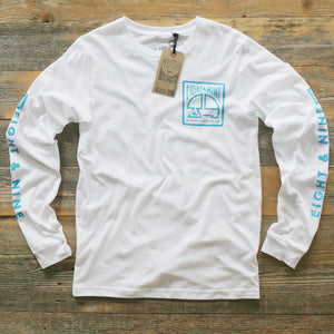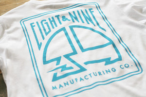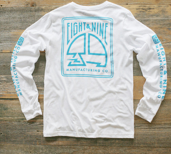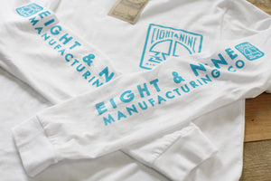 8&9 Manufacturing Co. Long sleeve white with electric blue for Fall '14. Left chest, full back and two sleeve hits. Super clean. Simplicity reigns supreme. Get yours while you can.