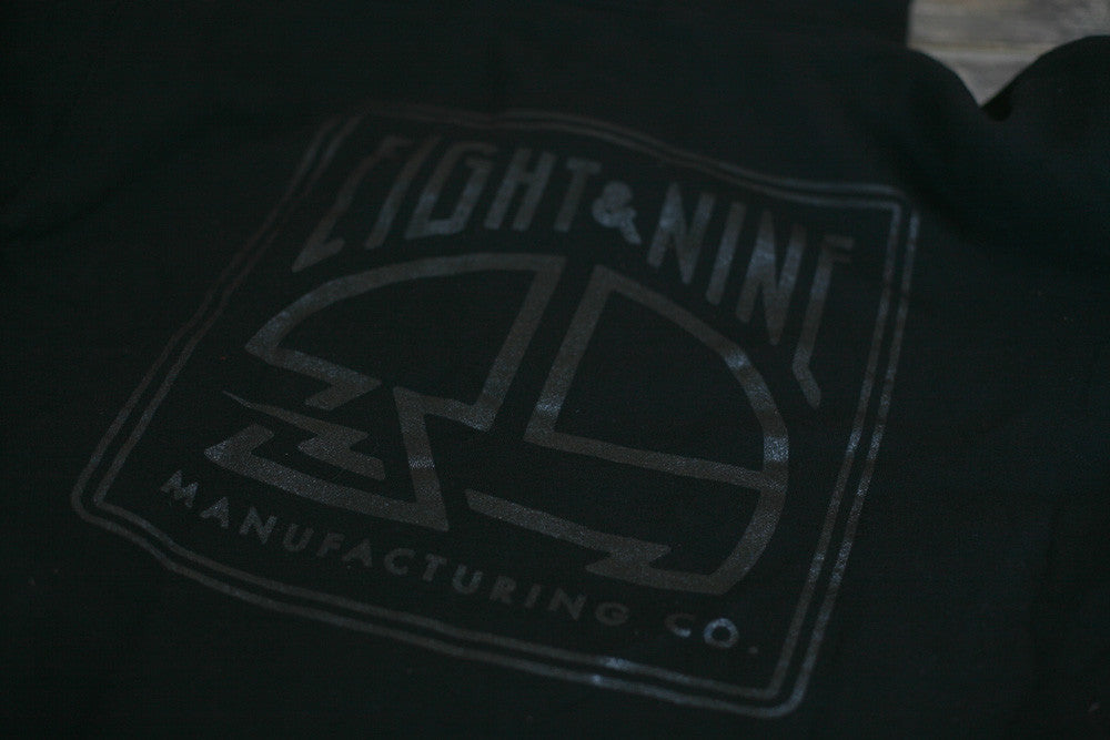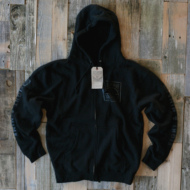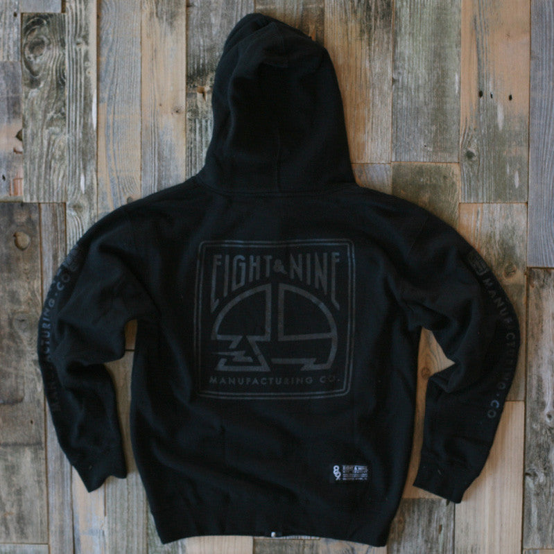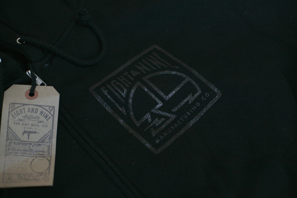 8&9 Manufacturing Co. Miami, FL. Simplicity reigns supreme. Stealth, Black on Black high density gel print front and back. Heavy-weight sip up hoodie. Get yours while supplies last.