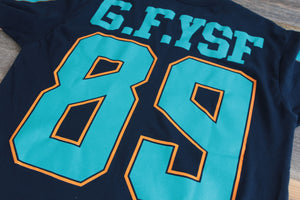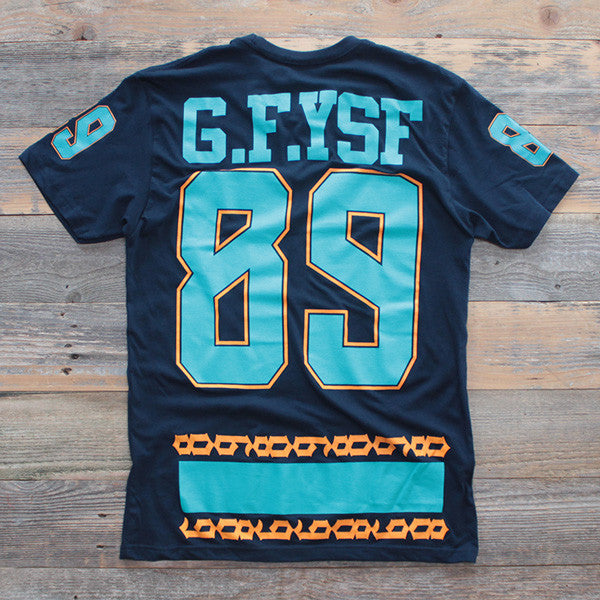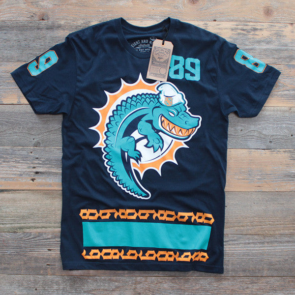 New colors for Fall '14 the latest of our 3 part Florida team jersey mash up collection w/ Freehand Profit. Dolphins x Gators. Navy body with new dolphins team colors. Rep the sunshine state or just because. GFYSF plus giant 89 hit with cuban link inspired trim. Definitely a Miami classic jersey. Get this one while you can. Certainly won't last long.