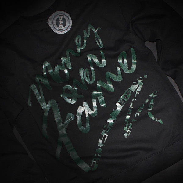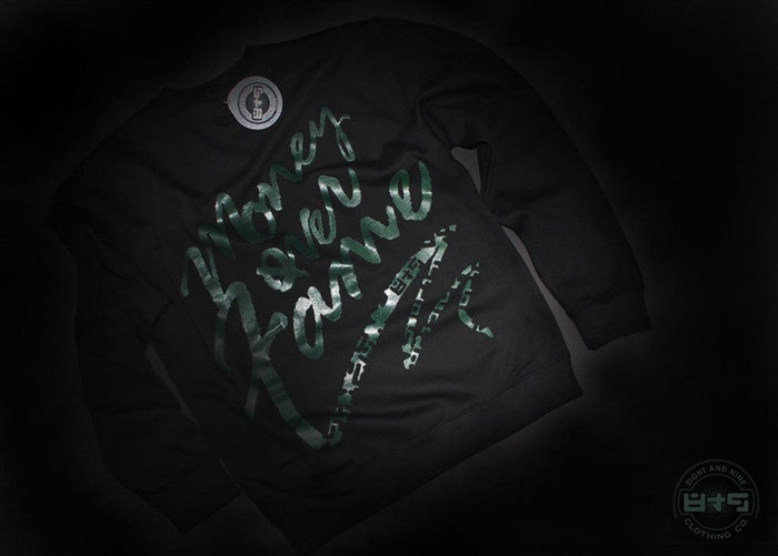 Money Over Fame sweatshirt is with exclusive dark pine ink only available from 8&9 Clothing Co. The choice is easy, Money Over Fame, get your shirt to match Dark Pine Foamposites Pros from us.