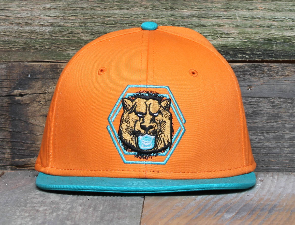 Vintage fall inspirations, Monarch of all. Set on tangerine w/ aqua detailing this cap is classic and clean. Call it Dolphins if you will. 3-D Raised Embroidery w/ Eight & Nine print under visor, embroidered arc, strapback closure and woven.