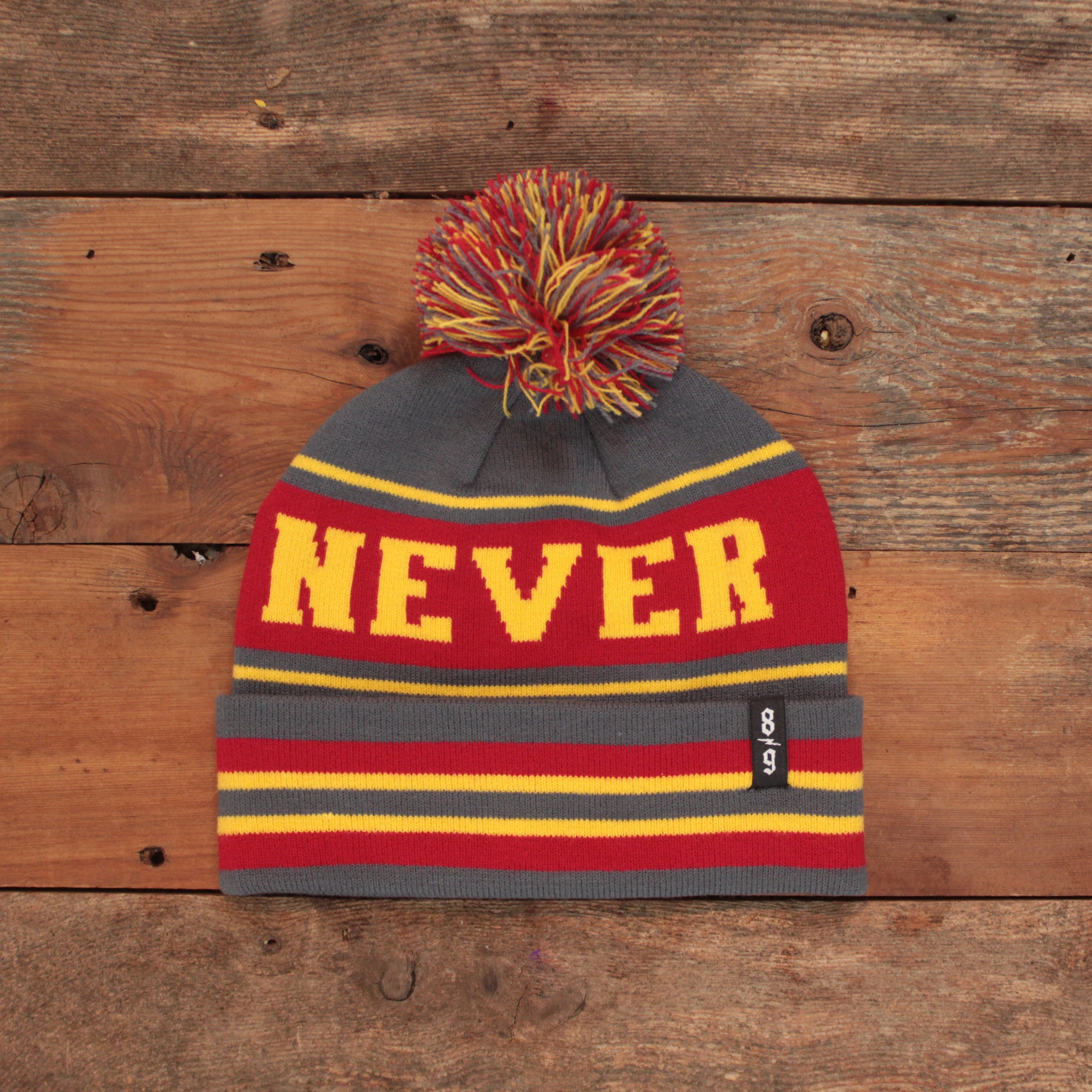 100% Super Soft Acrylic Knit, Ribbed, Jacquard Pattern, Cuffed or Slouch Styling. Cool Grey/Red/Yellow striped hat with Never Sleep detailing and 8&9 woven.