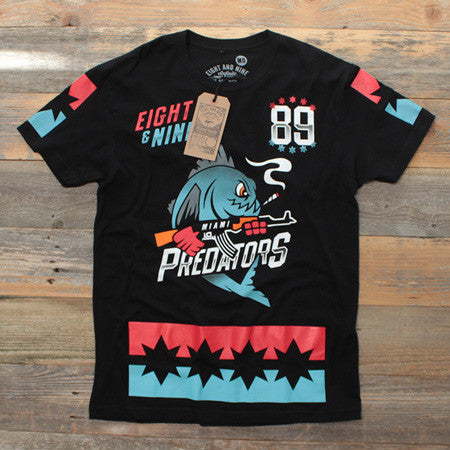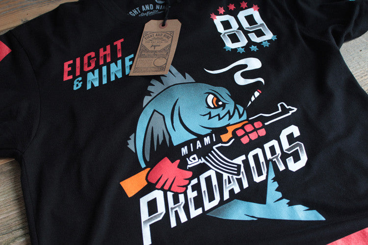 New fall '14 hockey inspired Predators Jersey tee. Chopper, mohawk, splif, red eyes, Predator Never Prey. Huge 89 back print, chest emblems, stripe detailing & sleeve hits. Black/Teal/Fire Red color scheme. S-4X.