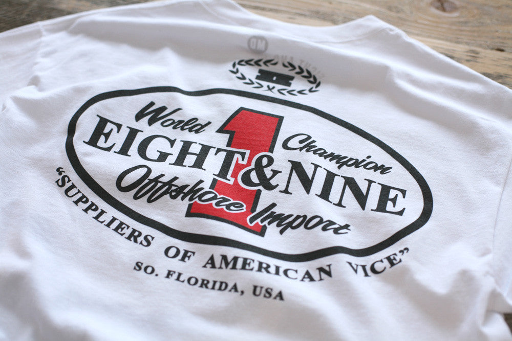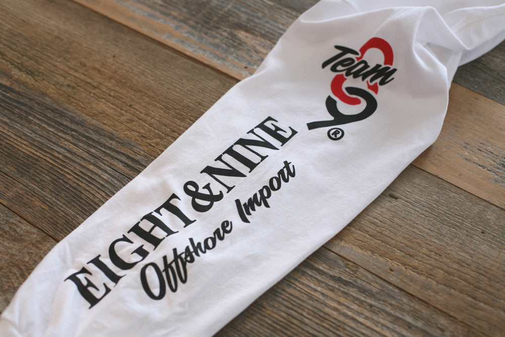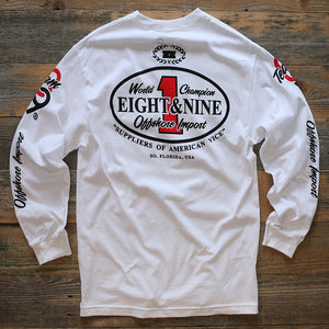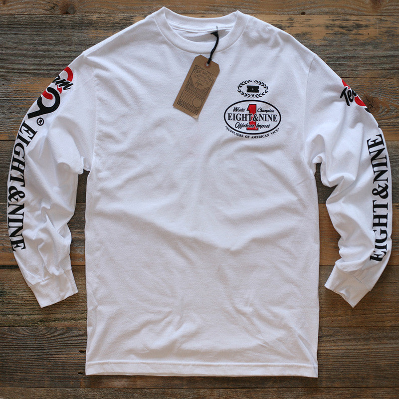 Heavyweight construction for Winter '14. Offshore Imports L/S Tee race jersey tee. "Suppliers of American Vice." South Florida inspired OG Cigarette Team racing graphic. Offshore Imports classic color scheme. #8and9life.