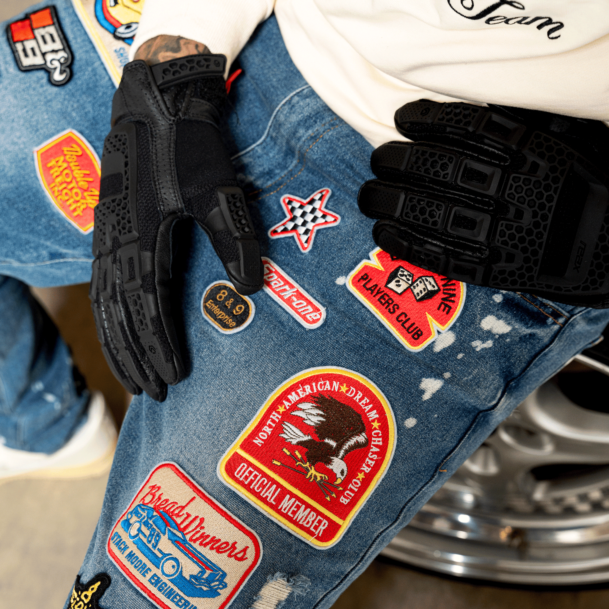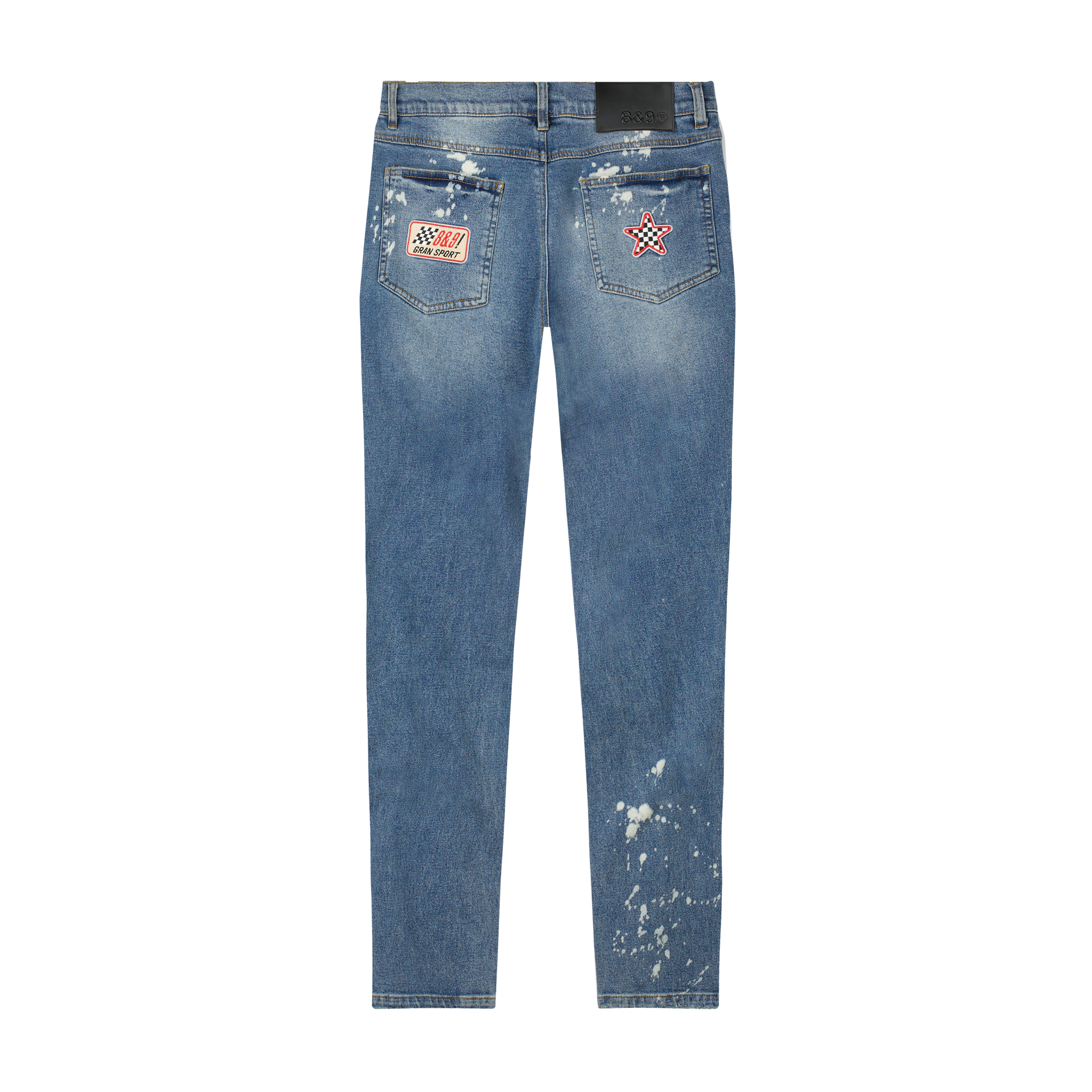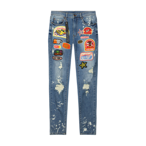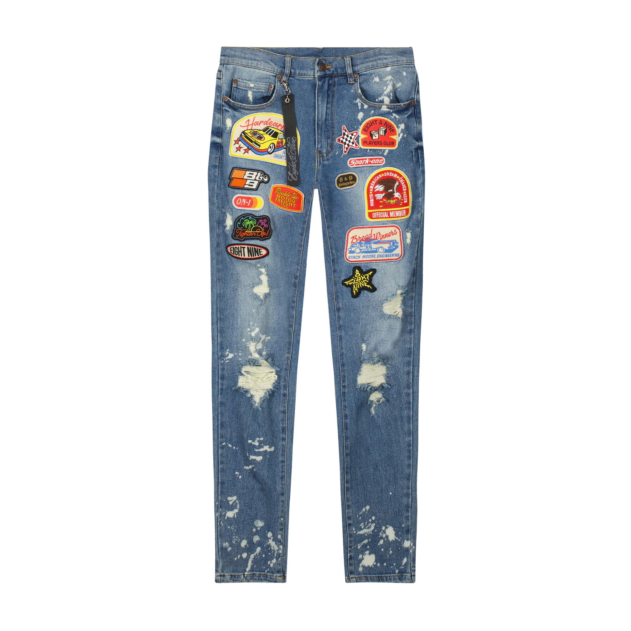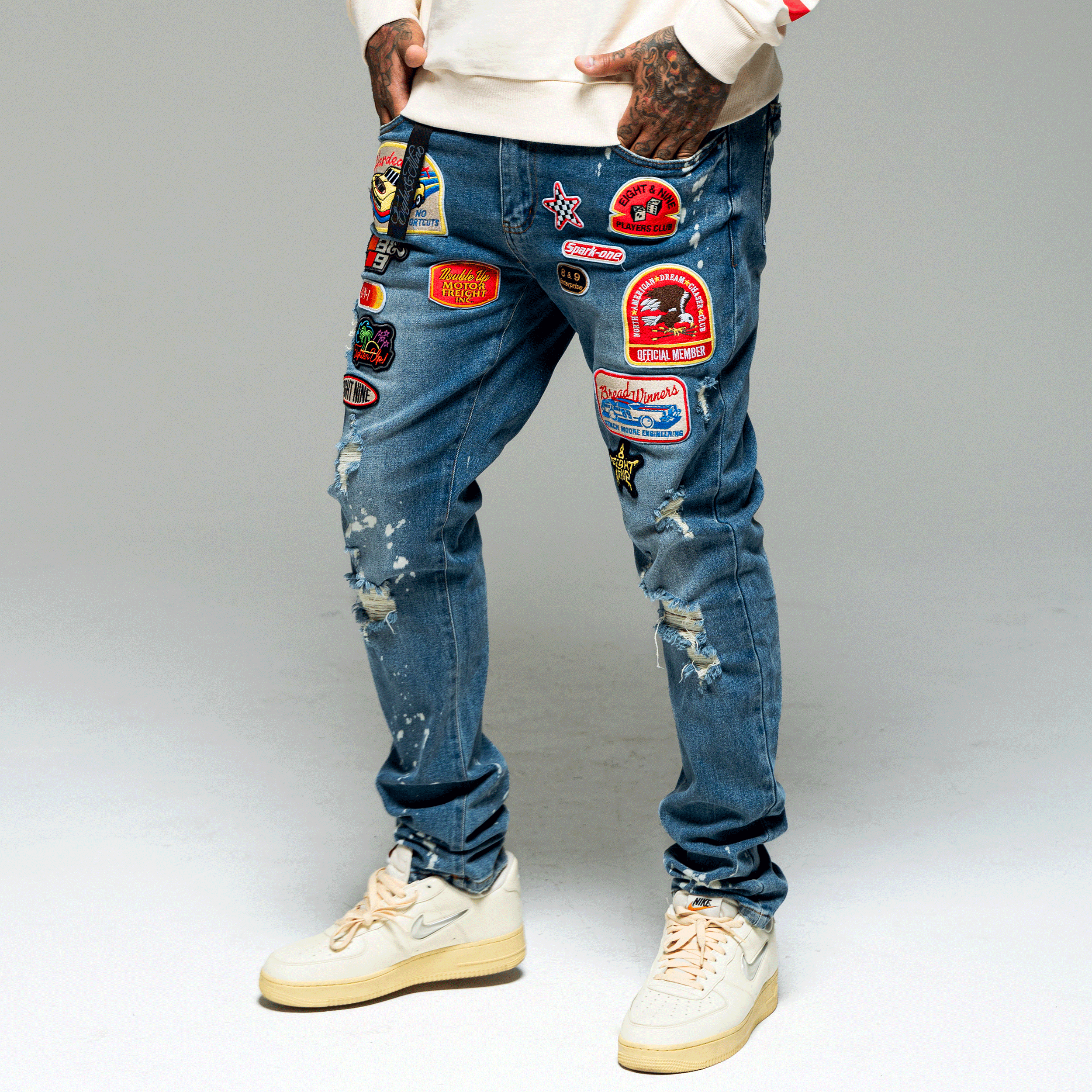Premium blue denim, subtle wash, distressed with multiple embroidered patches. Sizes 28 to 42 shipping out now!