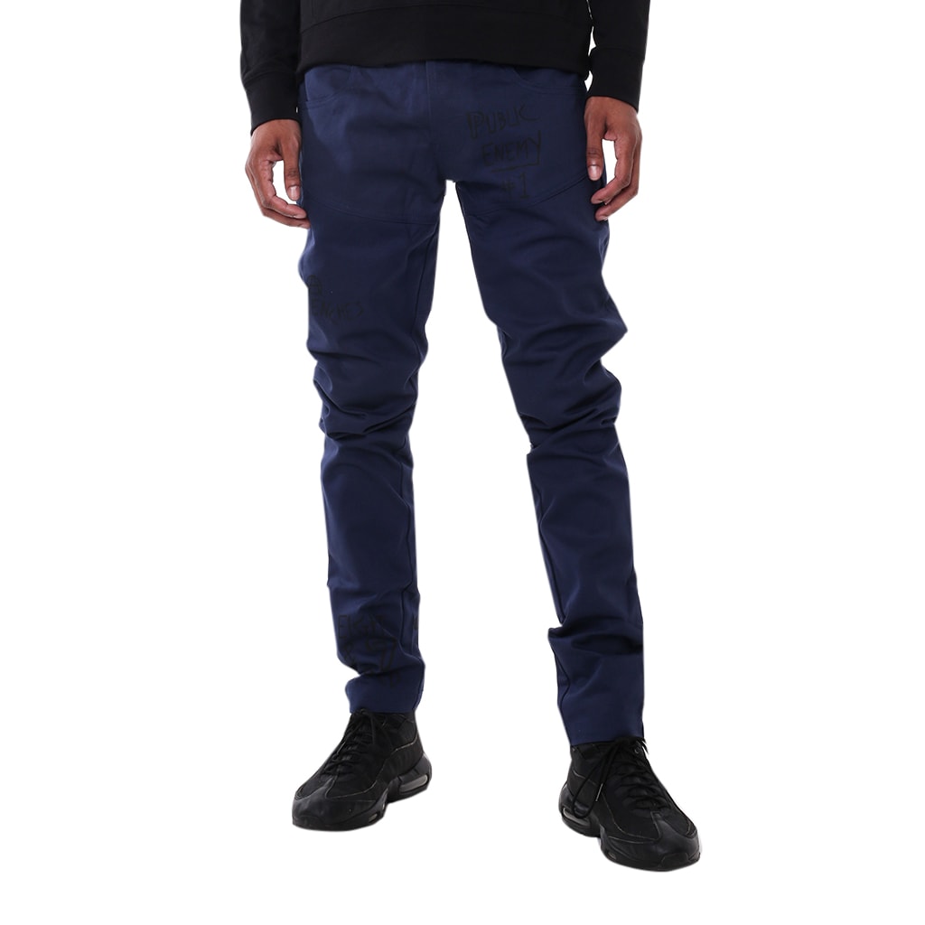 A navy blue flight pant with scribble details and patchwork. Premium construction, reinforced seat, seems, and knees. Paneled front & hammer loop. The fit is modern, slim from the knee down, room to move up top, regular rise, waist is true to size. 100% Cotton men's flight pants in navy blue. Deeds Over Words Collection.