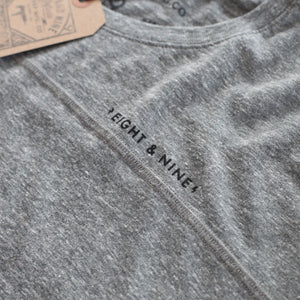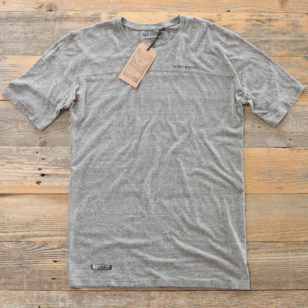 Made in the USA. Premium cotton modal heather grey football cut t shirt with a modern tailored fit and +2 length. Football cut is the panel across the garment's chest and the extra length on the sleeve designed to be worn down or rolled. It's perfect because we took the time to build it, in the USA, from scratch using the highest quality materials then perfected the fit and details. Eight & Nine subtle chest print, Go Fuck Yourself inside the hem, and Trench Mark woven. Simplicity reigns supreme. Peep the details. Note: This is not a tall tee, it's designed to land below your belt. If you're a t-shirt connoisseur this might be the finest you've worn. Sure to be a daily wear so we offered it in 3 colors.