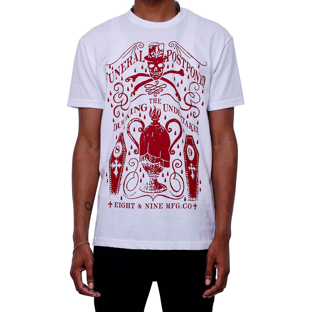 Stay alive long enough to live, that's the goal. New piece from the Rebirth Collection, "Funeral Postponed" ducking the under taker. White tee with maroon print, skull and bones imagery. Great shirt to match Jordan Maroon 6. Peep the details.