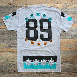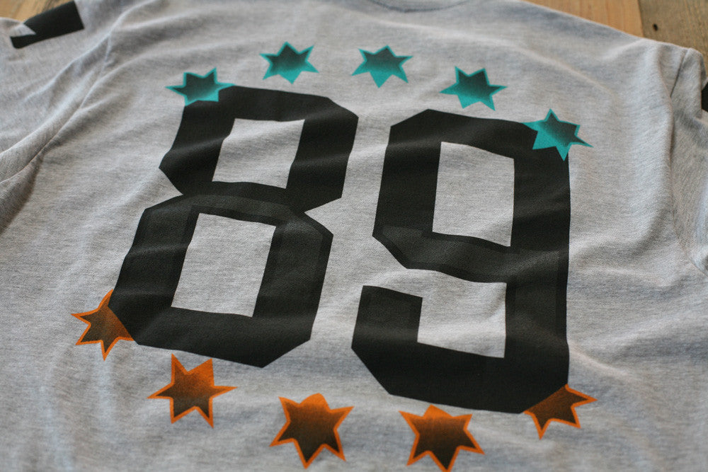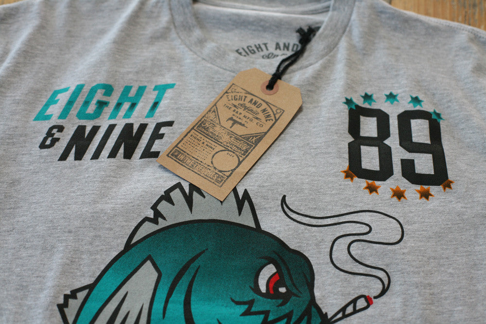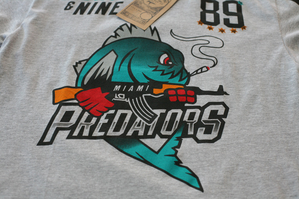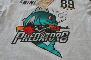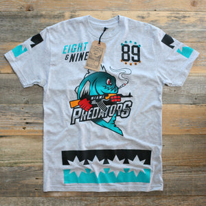 New Winter '14 hockey inspired Predators Jersey tee. Chopper, mohawk, splif, red eyes, Predator Never Prey. Huge 89 back print, chest emblems, stripe detailing & sleeve hits. Previously released in The Showroom only we've dropped a limited quantity of the classic graphic online while supplies last. Premium Heather Grey/Teal/Black color scheme. S-3X.