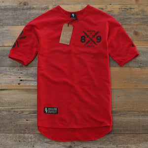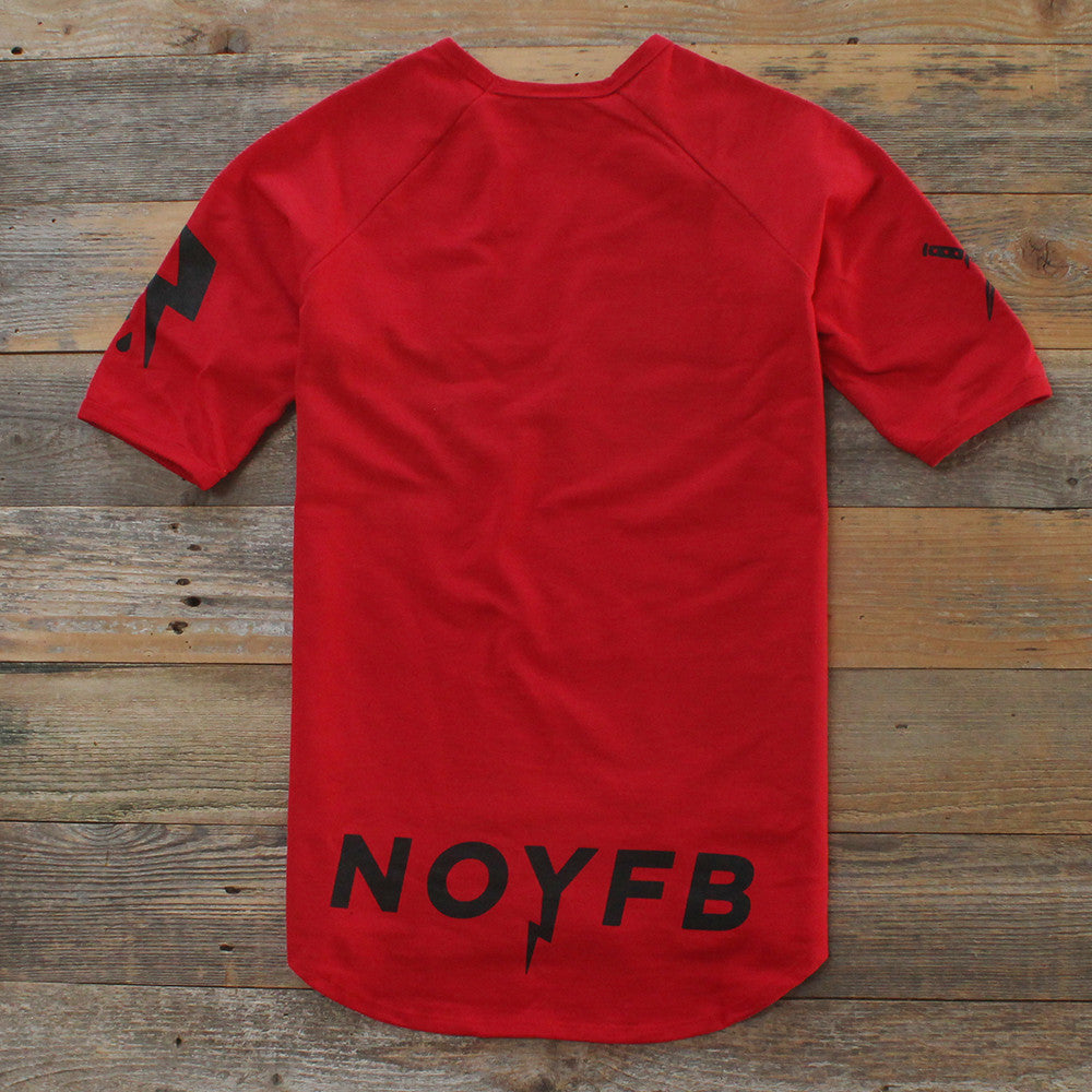 "NONE OF YOUR F'N BUSINESS" NOYFB french terry jersey. New for '15 we've created a mid sleeve crewneck raglan jersey from our premium french terry. Super luxe 100% cotton terry jersey with extra length, rounded hem, made in the USA. Peep the details NOYFB on the drop tail in black on premium red terry with woven label. Modern tailored fit.