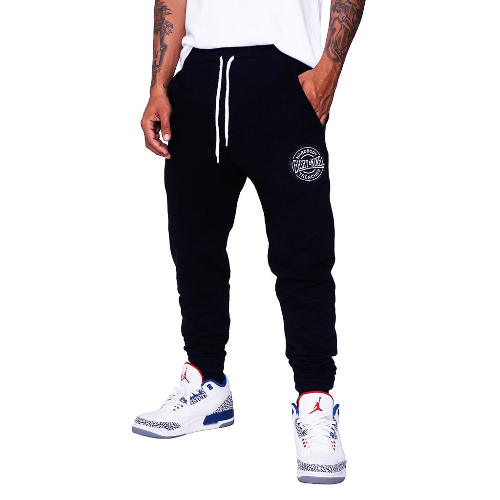 Hardbody! Officially next level, meticulously crafted Jogger Sweatpants in black with the hard body patch. Light-weight French Terry Joggers for all seasons, made in the USA. Black, premium terry jogger with white draw string, embroidered Hardbody patch, elasticized waistband, three pocket styling, rib knit tapered bottom. Modern tailored fit.