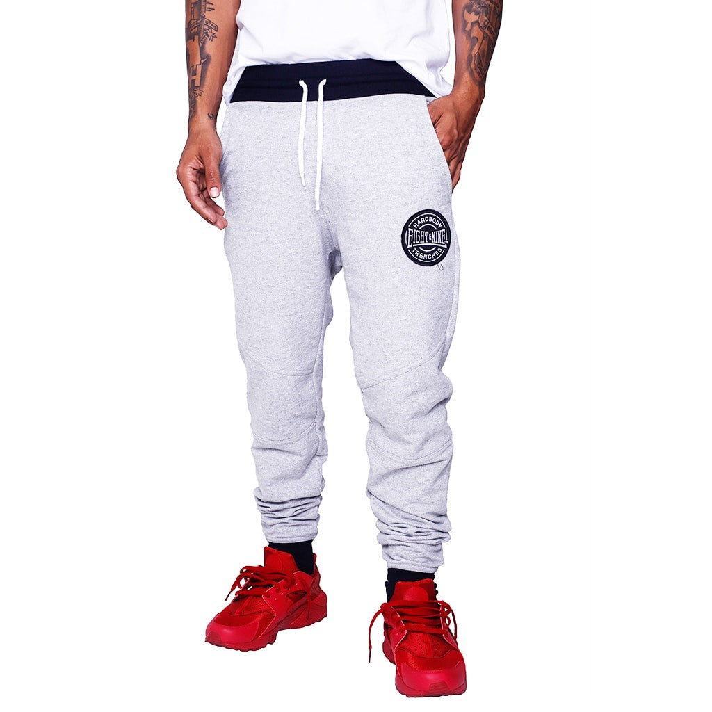 Hardbody! Officially next level, meticulously crafted Jogger Sweatpants in heather grey with black contrast cuff and the hard body patch. Light-weight French Terry Joggers for all seasons, made in the USA. Heather grey, premium terry jogger with white draw string, embroidered Hardbody patch, elasticized waistband, three pocket styling, rib knit tapered bottom. Modern tailored fit.