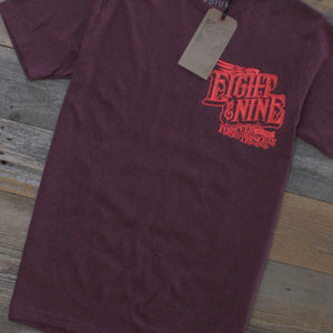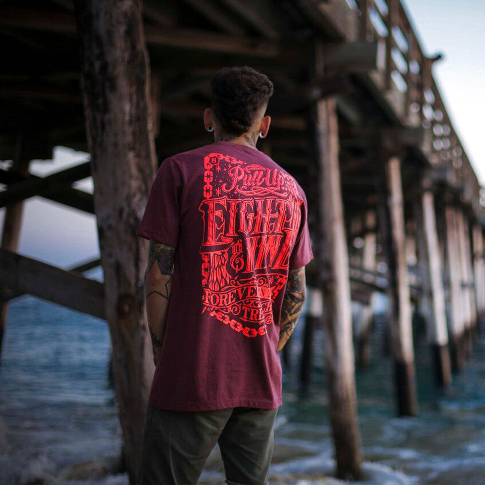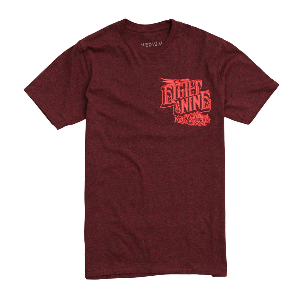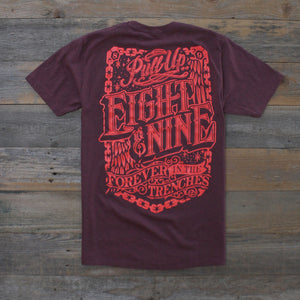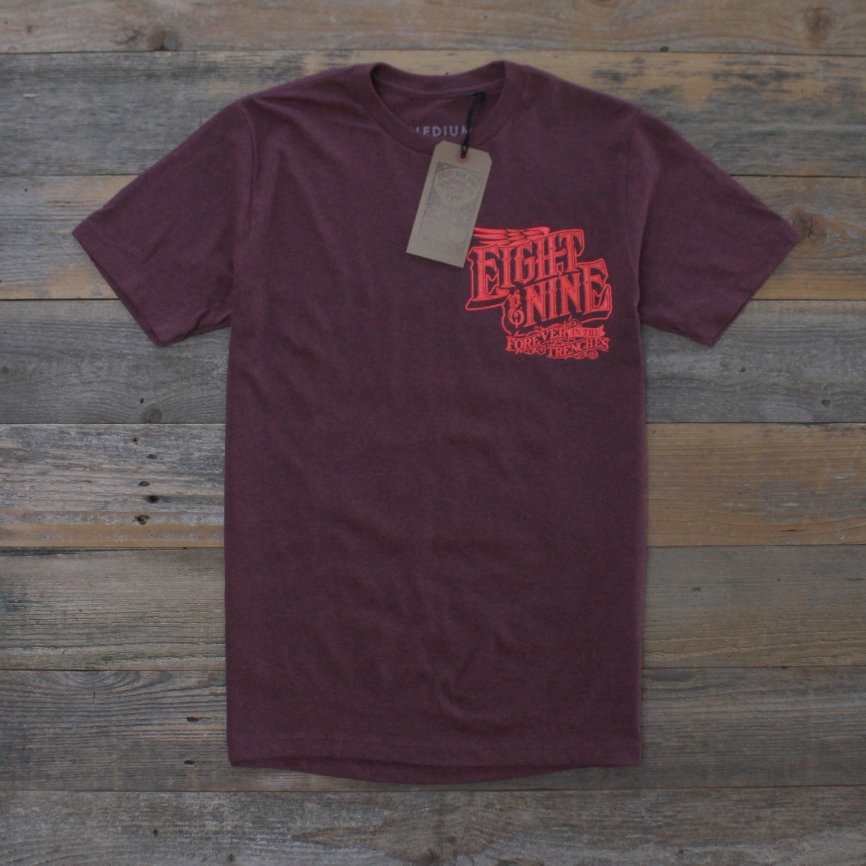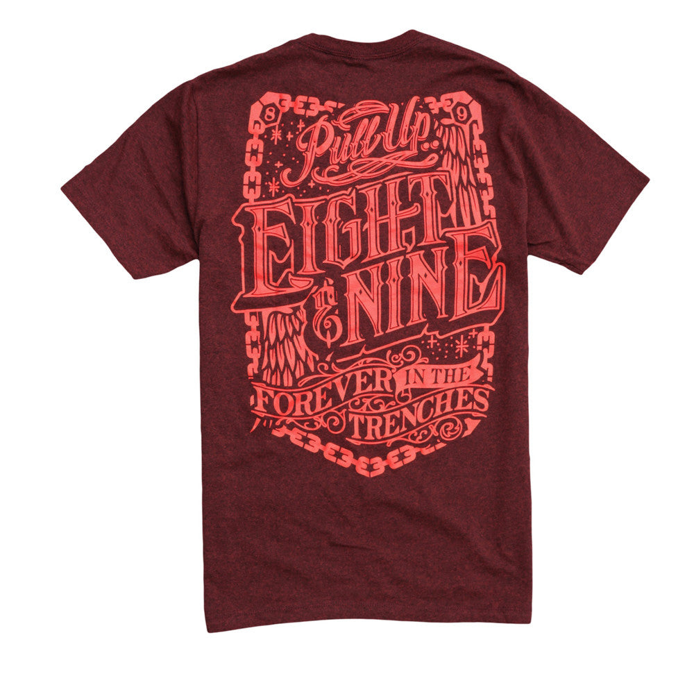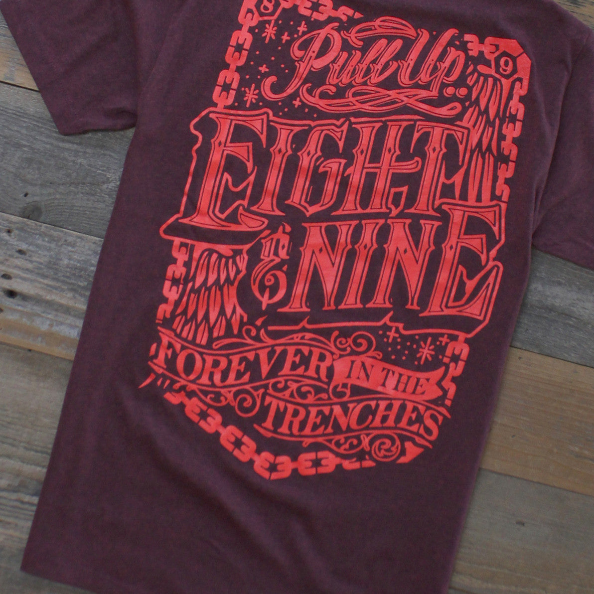 Peep the details. "Forever in the trenches" #8and9life Pull Up T Shirt on premium burgundy trip-blend.