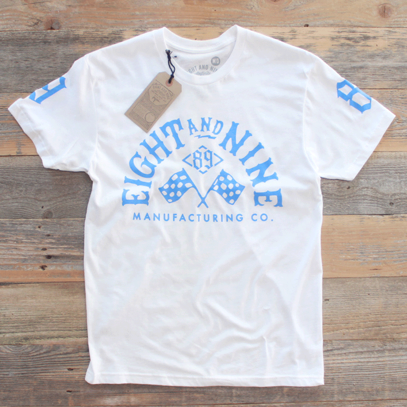 New for holiday '14. Race Flags T-Shirt to match Legend Blue Jordan 11. Check the details, premium white ring spun cotton, super soft w/ legend blue print. Definitely grab one for your collection. Simplicity reigns supreme.