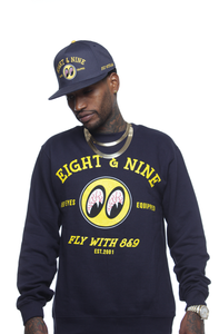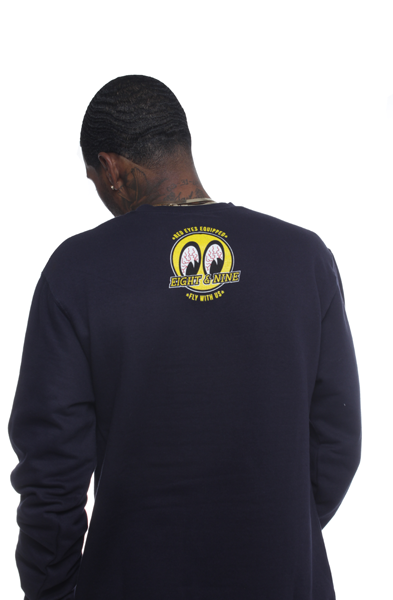 Fully equipped. 24/7. Red Eyes Equipment graphic full front and back center neck hit. Another vintage inspiration for the end of '13. Fast Life. Race On. Navy/True Yellow/Sport Red on jet black super soft 100% cotton sweatshirt.