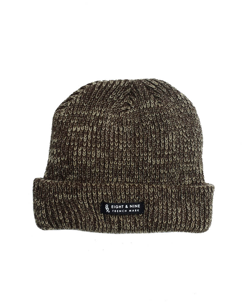 Classic blue collar vibe that never goes out of style. Ribbed Dock Beanie Brown Marled. Trench Mark woven. 100% Super Soft Acrylic Knit, Ribbed, Cuffed.