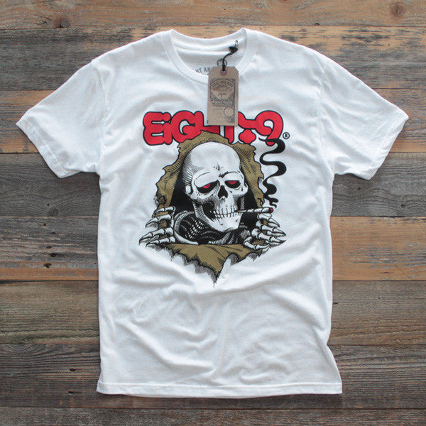 Our latest tribute piece. Bones, 80's skate, some of the sickest art from a generation of pioneers. Ripped Rippers eyes low, rolled up, #8and9life. White tee. Classic.