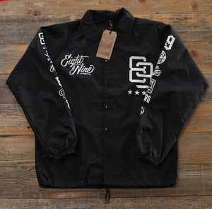Lightweight for Spring '15. Rise Above Coaches Jacket Black with front, back, and sleeve hits. 100% Nylon water repellant windbreaker. Black and white color scheme.