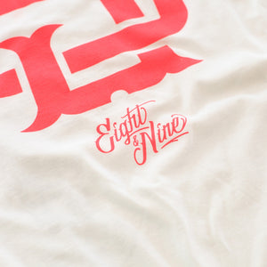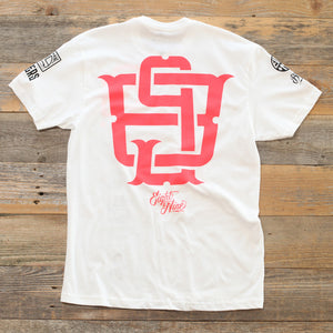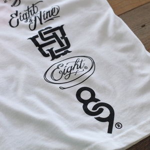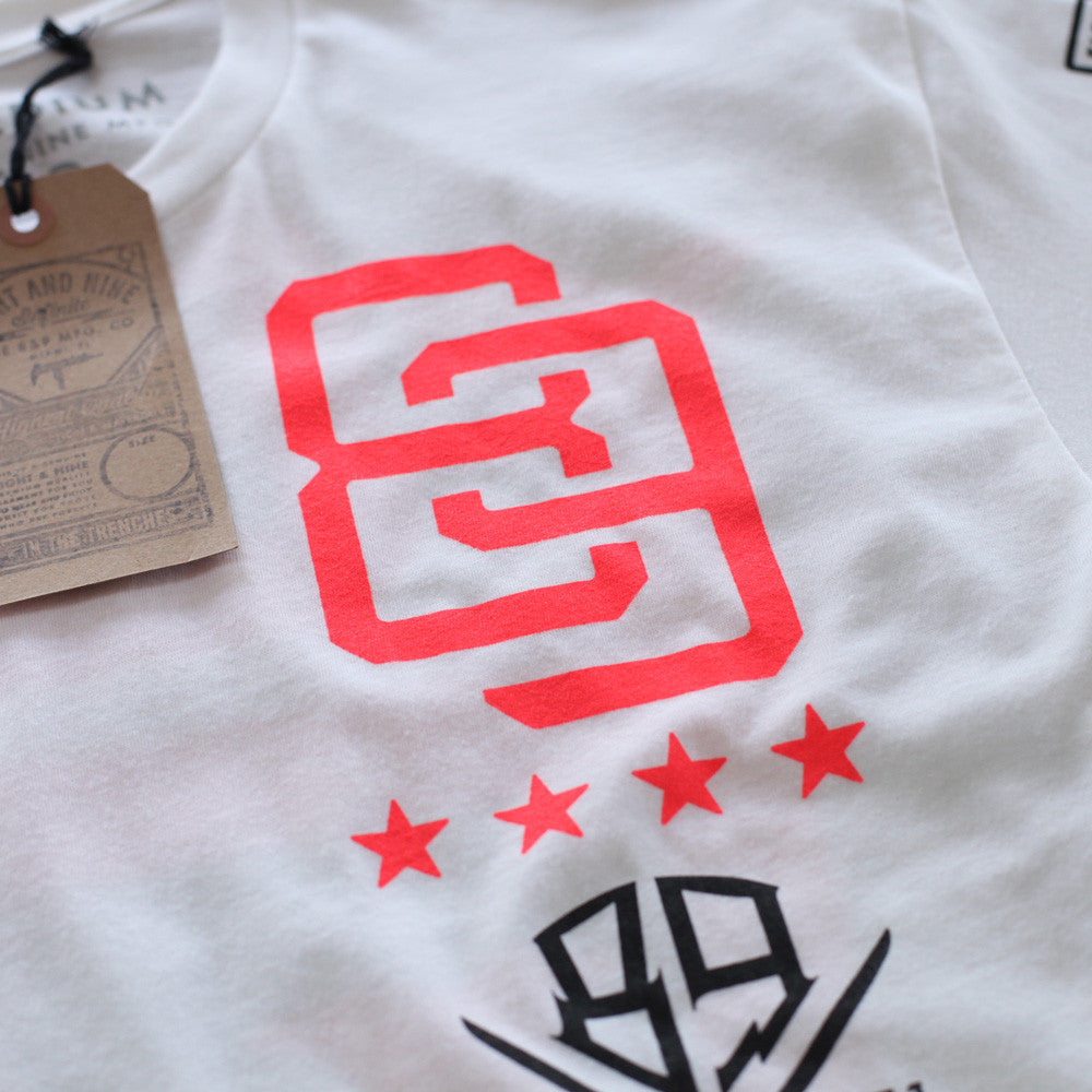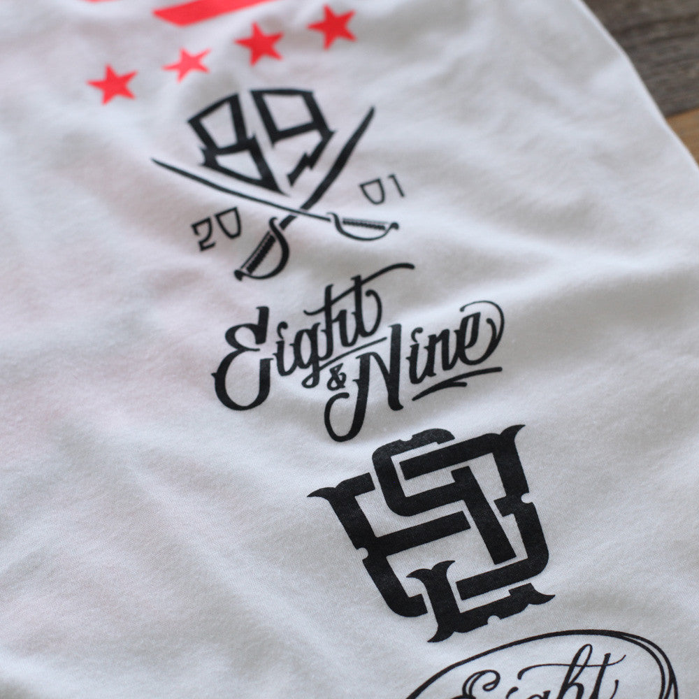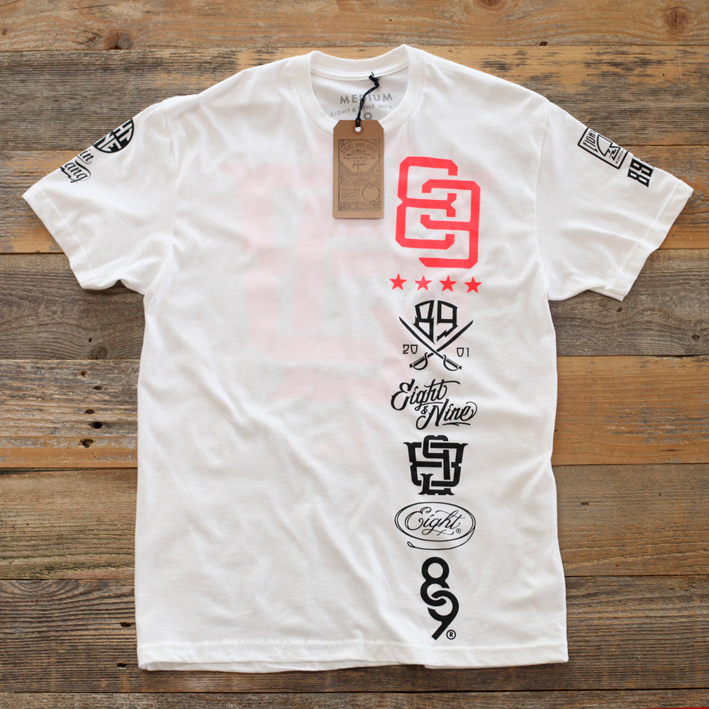 Our new Rise Above tee is in stock and shipping now. This tee features a bunch of our classic logos. Clean infrared color scheme, premium white cotton. This is a dope shirt to match Jordan Infrared 6 white high and low. #8and9life