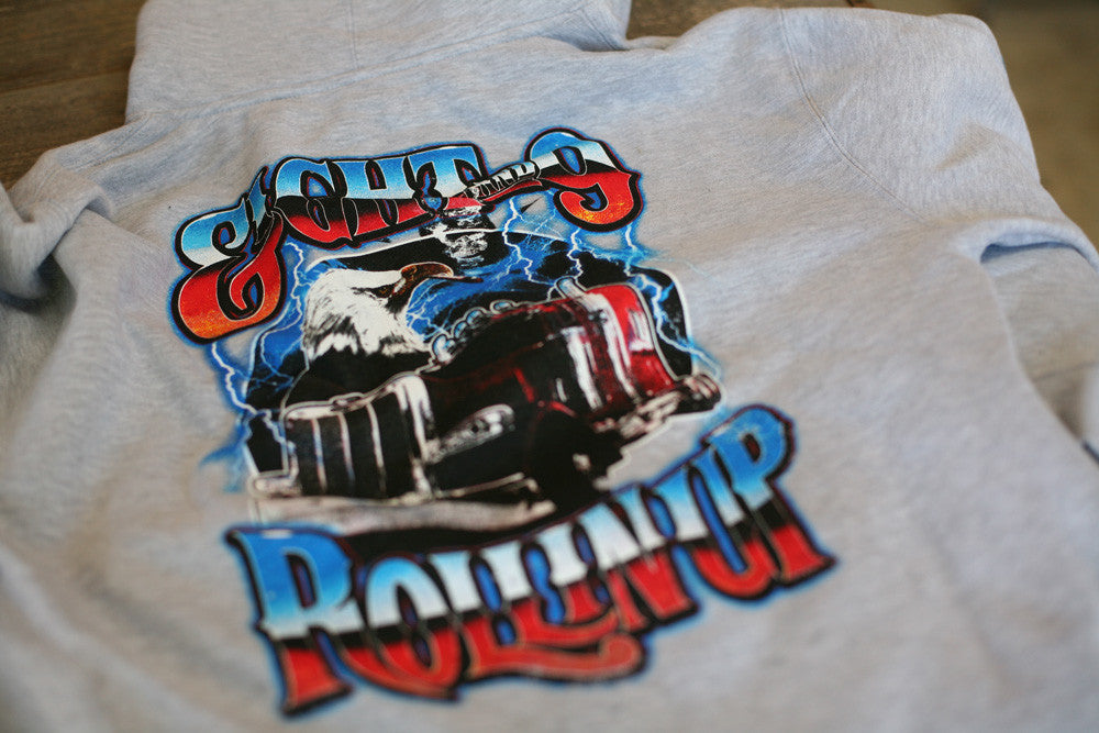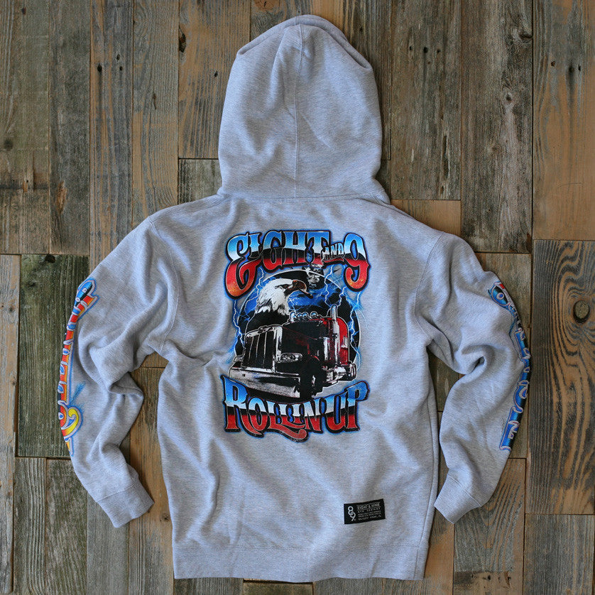 Truck stop inspired vintage Rollin' Up print on our premium heavyweight pull over sweatshirt in heather grey. Americana, smoking eagle, mack truck what else can you ask for? Super classic styling for Fall '14 #8and9life