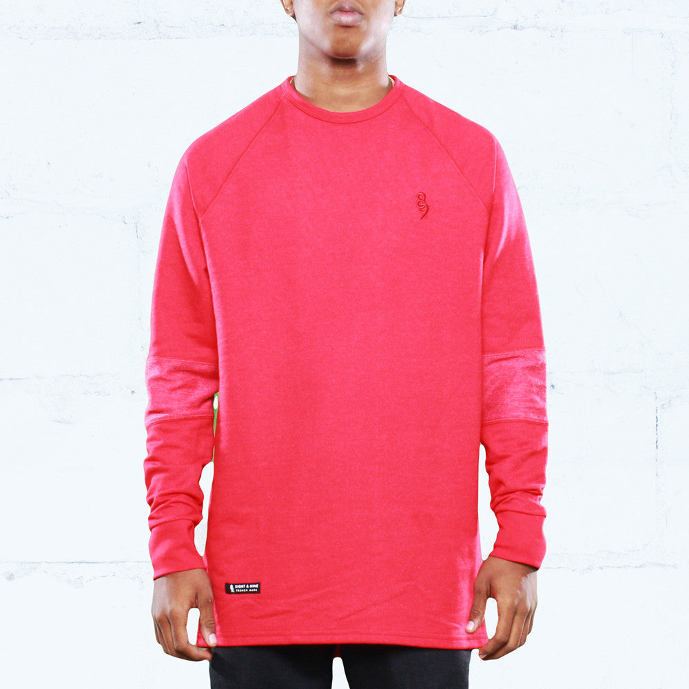 New for all seasons the Rudimental terry collection. This piece, the Rudimental Paneled Terry Jersey in red is made here in the US from super luxe 100% cotton french terry. We've given it an elongated fit with added length, slight drop tail, reverse paneled sleeves with cover stitch and a tonal red keys embroidery. Peep the canvas trenchmark woven. Simplicity reigns supreme. Details always matter.