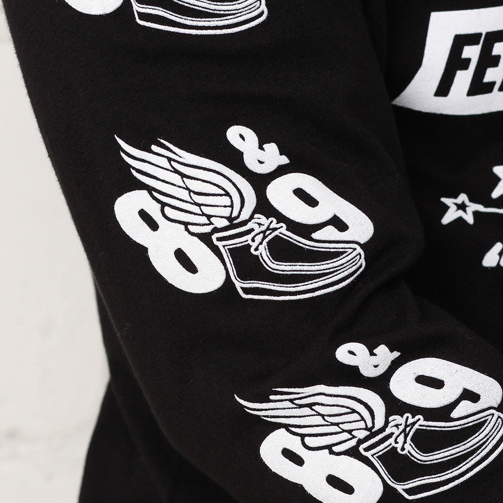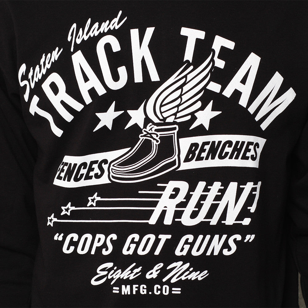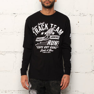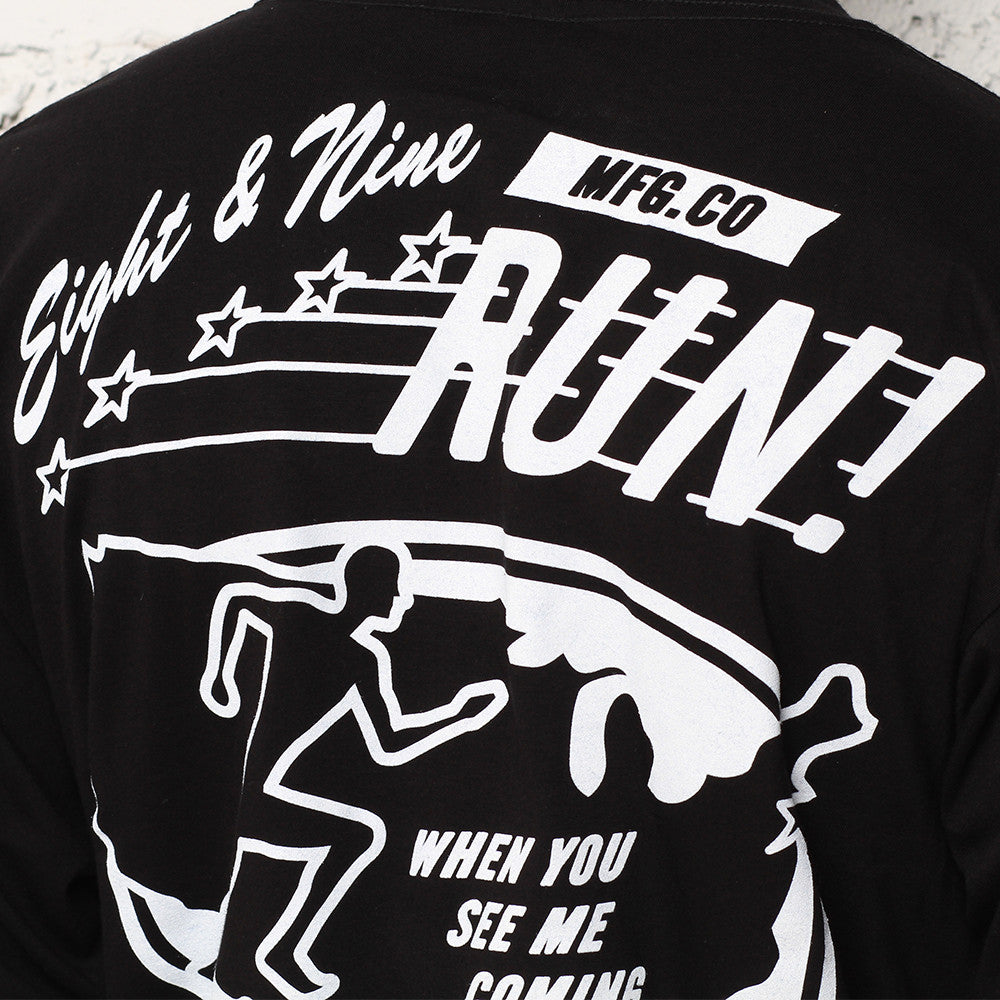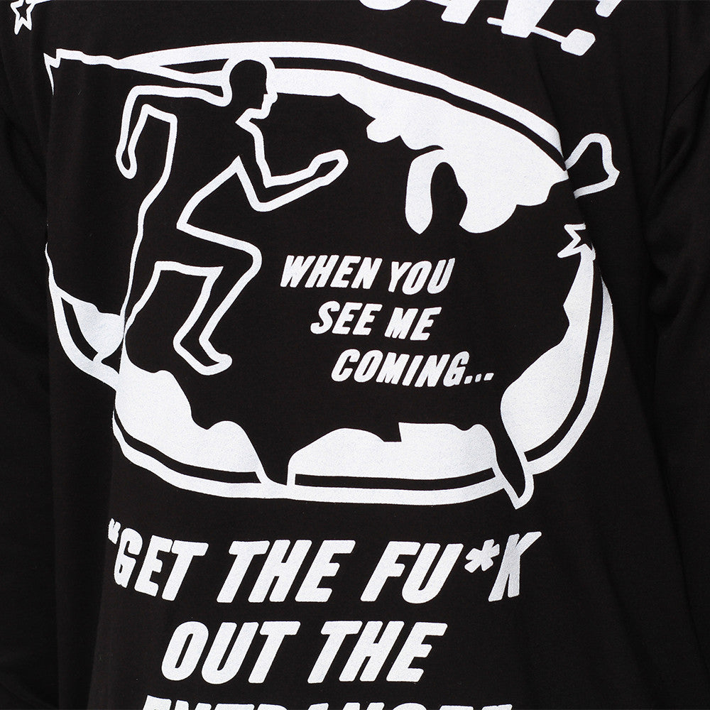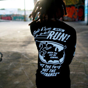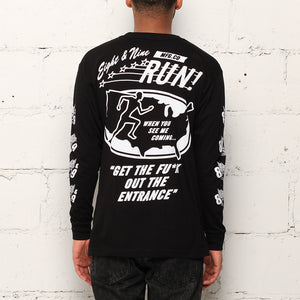 "Run Cops Got, Guns!" You already know, Run! GFK inspired, classic hip hop shit. Run Long Sleeve T Shirt black and white. Another slaughtered piece for the season, this one's got the RUN treatment front back and both sleeves.