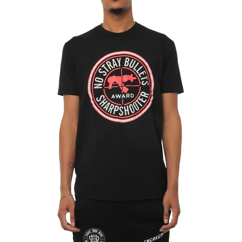 No Stray Bullets. Sharpshooter, Award Winning Marksman. Classic black tee with the Sharpshooter graphic in red and grey! Premium mens tee cut from the finest ring-spun cotton jersey for a soft, comfortable fit that is true to size. No restocks. S-4xl