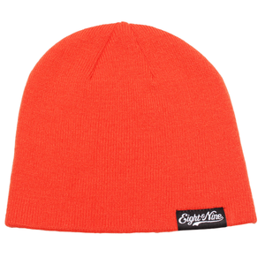 100% Super Soft Acrylic Knit, Ribbed, Uncuffed Only. Hunter Orange hat with black/white Eight & Nine woven label.