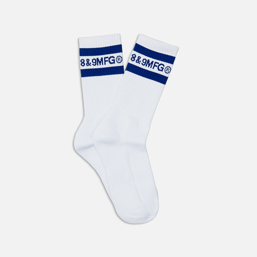 New Slapped socks in white with blue details! Super comfortable, mid length, mid weight socks for every day use.